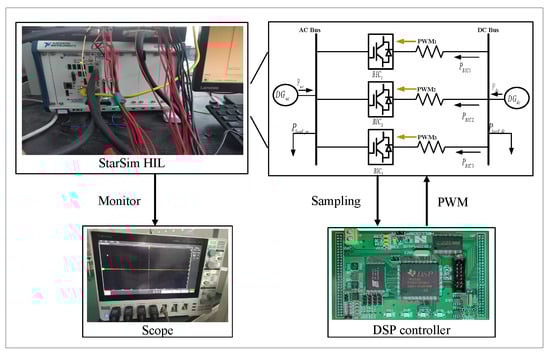 In this section, the hardware-in-the-loop (HIL) experiments are tested to further verify the performance of the fixed-time consensus control based on event-triggered control for islanded HMG parallel BICs through the StarSim HIL realtime simulator. In this HIL experiment, the controller, which includes four BICs, is used in the DSP (TMS320F28335) controller when the other parts of the system are simulated in the HIL simulator. This system is shown in Figure 15.