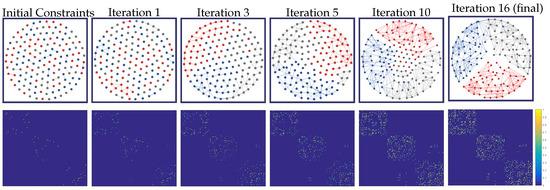 Illustration of must-link constraints evolution by self-learning for the IRIS dataset. The first row shows the must-link connection graph of the points by visualization software Gephi (https://gephi.org/, accessed on 29 April 2025) with the Fruchterman Reingold layout algorithm, and the second row shows the corresponding matrices. Points in the same ground truth category are printed in the same color.