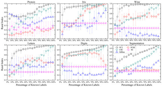 As mentioned earlier, both label and pairwise constraints can be formed as must-links and cannot-links. However, pairwise-constrained clustering poses more of a challenge for finding clusters from data. So, we conducted separate comparison studies on these state-of-the-art semi-supervised clustering algorithms with different types of constraints. In order to examine the effectiveness of constraints for clustering, spectral clustering is applied as the baseline method without any constraints. In our experiments, we will report the Rand Index (RI) of all algorithms against the number of pairwise constraints and the percentage of known labels.