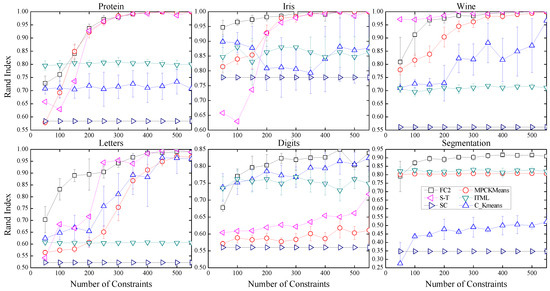 We chose three commonly used datasets from the UCI Archive including Iris, Wine, and Segmentation, the Protein dataset from the literature [27], and randomly sampled subsets from Digits {3, 8, 9} and Letters {I, J, L} handwritten character recognition datasets as suggested by Basu et al. [6]. These datasets come from different domains with various numbers of instances. The statistics of these datasets are listed in Table 2.