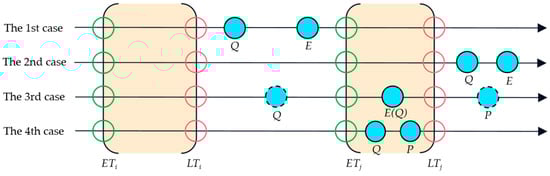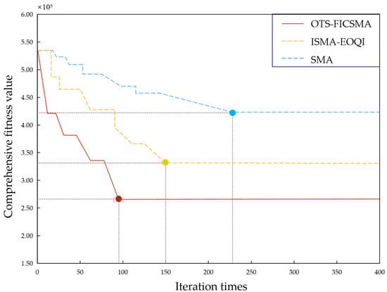 - This study provides a new idea for solving models. It innovatively integrates the improved OPTICS algorithm, considering temporal–spatial distance and the improved slime mold algorithm with a full iteration cycle, thus constructing the neighborhood search–swarm intelligence algorithm OTS-FICSMA [27]. The nodes with similar time and space dimensions are first clustered through this improvement to generate the initial solution. Then, the intervention optimization is carried out on the full cycle of the initial solution iteration to improve the quality of the solution continuously. Finally, the solution performance of the algorithm is greatly improved.
