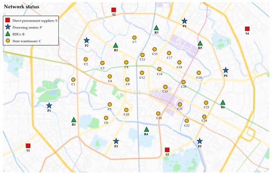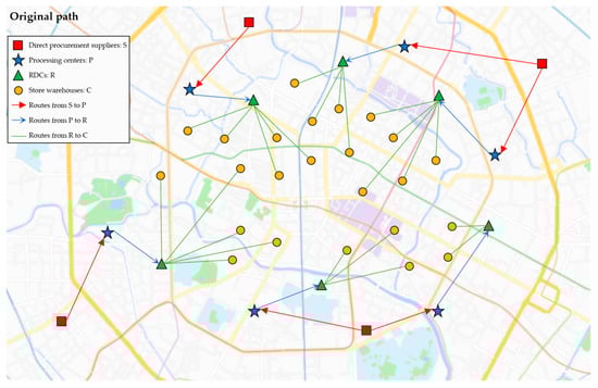 - Cross-level procurement strategy: this allows fresh products to be directly transported from processing centers to store warehouses, saving the operation cost of RDCs and enhancing flexibility. However, the unit transportation cost of direct delivery to store warehouses is generally higher than through the RDCs.