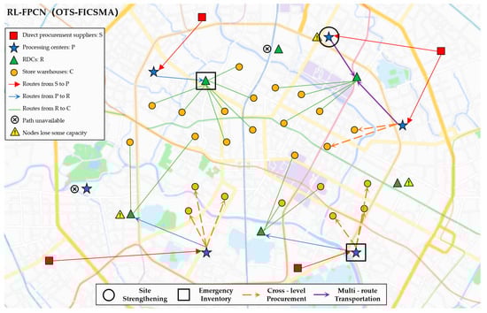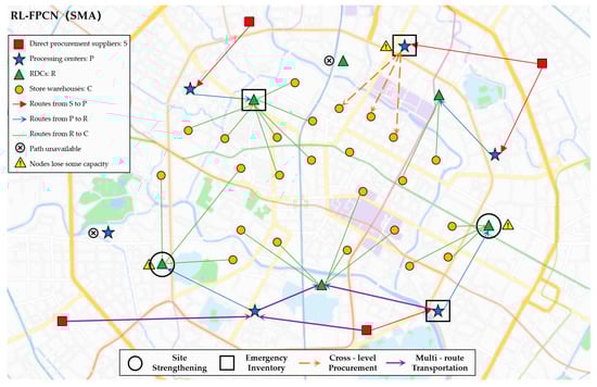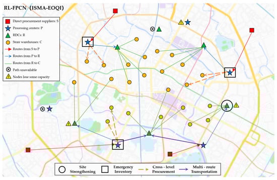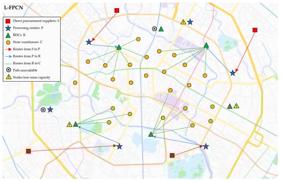 - Traffic flow balance constraints: Equations (14)–(16) indicate that a product flow is generated between two nodes only if the path between them is selected and available. There are no capacity constraints on these routes. , , and are all binary variables, representing the road conditions from supplier i to factory j, from factory j to RDC k, and from RDC k to store warehouse l, respectively, under the supply disruption scenario o. If the road between the corresponding nodes is disrupted, the value is 1; otherwise, it is 0.