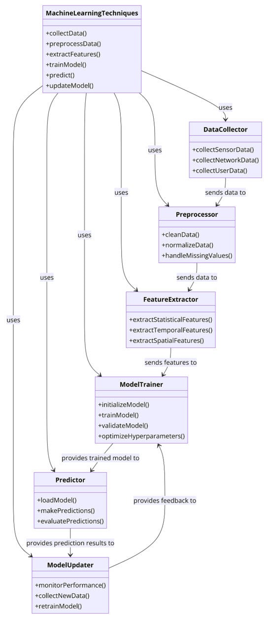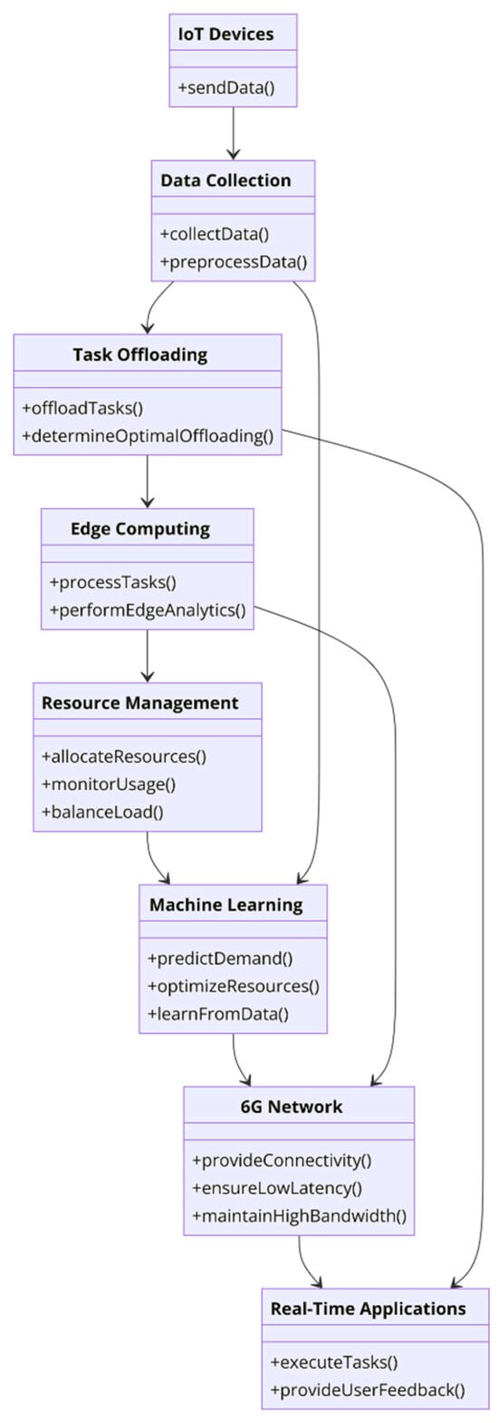 By integrating these advanced machine learning techniques, the ARMO model provides a robust framework for enhancing decision-making processes in real-time IoT applications, optimizing resource allocation, and improving overall system performance in edge computing and 6G networks. The UML diagram for machine learning techniques for enhanced decision-making, as presented in