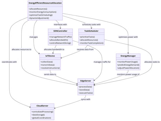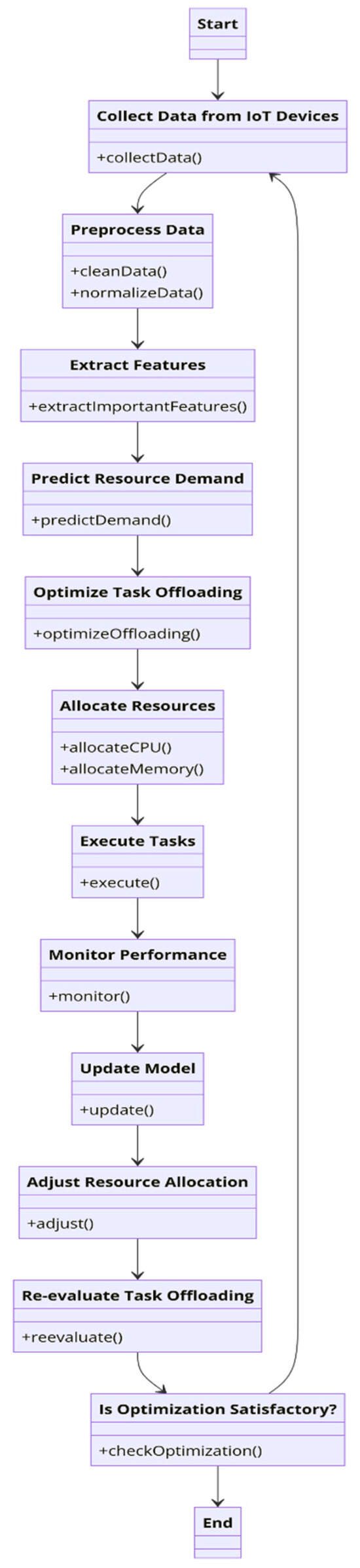 The energy-efficient resource allocation scheme is designed to optimize the usage of computation and communication resources within edge computing and 6G networks, aiming to minimize the total energy consumption while maintaining high performance levels for real-time IoT applications. This section presents the detailed mathematical models and equations underpinning our approach. We propose using deep learning models to predict resource demand and dynamically allocate resources based on real-time network conditions, implementing a hierarchical resource management framework that coordinates resource allocation between the central cloud, edge servers, and IoT devices, and developing an energy-aware scheduling algorithm that prioritizes tasks based on their energy consumption profiles and deadlines. The UML diagram for the energy-efficient resource allocation scheme shown in
