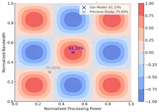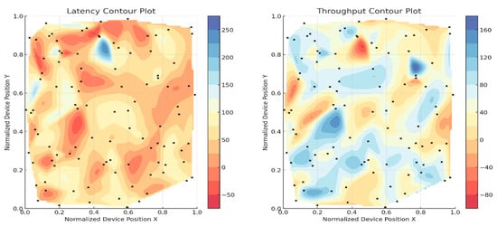 Figure 7 shows the contour plots for latency and throughput in edge computing with 6G and IoT devices. The left plot depicts the latency distribution, while the right plot illustrates the throughput distribution across different device positions. The latency contour plot reveals areas of high and low latency within the network, providing insight into the spatial variability of latency experienced by devices. High-latency regions, indicated by warmer colors, are primarily located in the central and upper sections of the plot. These areas likely represent zones with higher congestion or greater distance from the edge servers, resulting in increased data transmission times. Conversely, regions with cooler colors indicate lower latency, suggesting more efficient data processing and transmission in those areas. The throughput contour plot complements the latency findings by showing the distribution of data transmission rates across the network. Higher-throughput areas, depicted by cooler colors, correspond to regions where the network is capable of handling larger volumes of data more effectively. These regions likely benefit from the optimal placement of edge servers and robust network infrastructure, enabling efficient data flow and minimal delays. On the other hand, areas with lower throughput, indicated by warmer colors, may suffer from bottlenecks or suboptimal resource allocation, limiting the network’s data handling capacity. By analyzing these contour plots, it becomes evident that the integration of edge computing with 6G networks can significantly influence both latency and throughput. The spatial patterns highlighted in the plots provide valuable information for optimizing the placement of edge servers and managing network resources to enhance overall performance. Furthermore, understanding the variability in latency and throughput across the network allows for targeted improvements in areas experiencing suboptimal performance, ultimately leading to a more efficient and reliable edge computing environment for IoT applications.