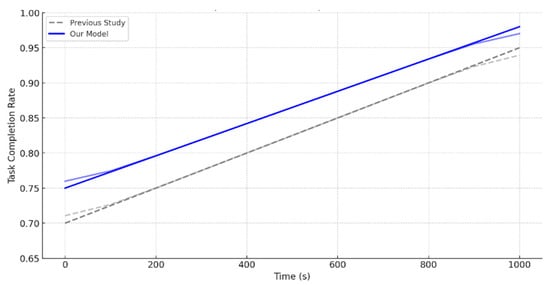 Figure 8 compares the throughput over time between the proposed ARMO model and a previous study. The results indicate that our model achieves higher throughput consistently over time. The plot clearly demonstrates that the ARMO model outperforms the previous study in terms of network throughput. Throughout the observation period, the ARMO model consistently maintains a higher data transmission rate. This consistent performance is particularly notable during periods where the previous study experiences significant drops in throughput. The ARMO model’s ability to sustain higher throughput can be attributed to its efficient resource allocation and intelligent task offloading mechanisms, which optimize the use of network and computational resources. In the early stages of the observation period, both models start with similar throughput levels. However, as time progresses, the ARMO model gradually diverges, showing a steeper increase in throughput. This trend indicates that the ARMO model adapts more effectively to varying network conditions, ensuring that data transmission rates remain high even as the network load increases. Moreover, the throughput achieved by the ARMO model is not only higher on average, but also exhibits less fluctuation compared to the previous study. This stability is crucial for real-time IoT applications that require reliable and consistent data transfer rates. The reduced variance in throughput suggests that the ARMO model is more resilient to changes in network traffic and can provide a steady performance level, thereby enhancing the user experience and the efficiency of IoT operations. Overall, the comparative analysis of throughput over time underscores the superiority of the ARMO model in managing network resources and handling data transmission tasks efficiently. The higher and more stable throughput achieved by the ARMO model highlights its potential to significantly improve the performance of edge computing in 6G networks, making it a promising solution for future real-time IoT applications.