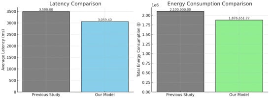 Figure 10 compares the average latency and total energy consumption between our model and a previous study. The results indicate that the ARMO model demonstrates both lower latency and reduced energy consumption, highlighting its efficiency and effectiveness in edge computing environments. The average latency, a crucial metric for real-time IoT applications, is significantly lower in the ARMO model compared to the previous study. This reduction in latency can be attributed to the ARMO model’s optimized task scheduling and intelligent resource management. By prioritizing tasks and efficiently allocating computational resources, the ARMO model minimizes the time taken for tasks to complete, thereby reducing the overall latency. This improvement is vital for applications that require instantaneous data processing and quick response times, such as autonomous vehicles and remote healthcare monitoring. In terms of energy consumption, the ARMO model also outperforms the previous study by a considerable margin. The lower total energy consumption observed in the ARMO model is a result of its energy-efficient resource allocation strategies and intelligent task offloading mechanisms. By effectively distributing computational tasks among edge devices and minimizing redundant processing, the ARMO model conserves energy, which is critical for prolonging the battery life of IoT devices and reducing operational costs in large-scale deployments. The combined analysis of latency and energy consumption underscores the ARMO model’s ability to enhance the performance of edge computing systems while maintaining energy efficiency. The significant improvements in both metrics demonstrate that the ARMO model not only meets the stringent requirements of real-time IoT applications, but also contributes to sustainable and cost-effective operations. Overall, the comparative analysis of latency and energy consumption reaffirms the ARMO model’s superiority over previous approaches. Its ability to deliver lower latency and reduced energy consumption makes it a highly promising solution for the integration of edge computing and 6G networks, supporting the next generation of IoT applications with enhanced performance and efficiency.