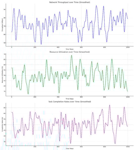 5.7. Network Throughput, Resource Utilization, and Task Completion Rates over Time