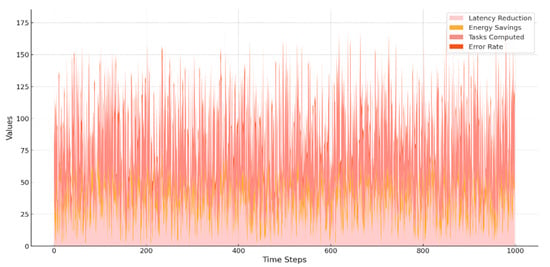 Figure 14 shows the stacked area plot of various performance metrics over time. The ARMO model achieves significant latency reduction and energy savings, and maintains a high number of tasks computed with a low error rate. The stacked area plot provides a comprehensive visualization of the ARMO model’s performance across multiple metrics over time. Each layer in the plot represents a different performance metric, allowing for an integrated view of how these metrics evolve and interact. The latency reduction layer demonstrates the ARMO model’s effectiveness in minimizing delays, which is crucial for real-time IoT applications. The consistent reduction in latency over time indicates that the model can adapt to changing network conditions and maintain efficient task processing speeds. The energy savings layer shows how the ARMO model conserves energy while managing computational tasks. This efficiency is particularly important for IoT devices, which often operate on limited power sources. The model’s ability to achieve substantial energy savings highlights its potential for sustainable and cost-effective operations. The number of tasks computed layer reflects the model’s capacity to handle a high volume of tasks efficiently. Maintaining a high number of computed tasks over time indicates the robustness of the ARMO model’s task scheduling and resource allocation strategies, ensuring that the system can meet the demands of a dynamic IoT environment. The error rate layer, which remains low throughout the observation period, underscores the reliability of the ARMO model. A low error rate is critical for the accuracy and dependability of IoT applications, ensuring that data processing and task execution are performed correctly. Overall, the stacked area plot provides a clear and detailed representation of the ARMO model’s performance across key metrics. The significant improvements in latency reduction, energy savings, task computation, and error rate reduction demonstrate the model’s comprehensive effectiveness and its suitability for enhancing edge computing in 6G networks. This integrated view underscores the ARMO model’s potential to provide high-performance, energy-efficient, and reliable solutions for the next generation of IoT applications.