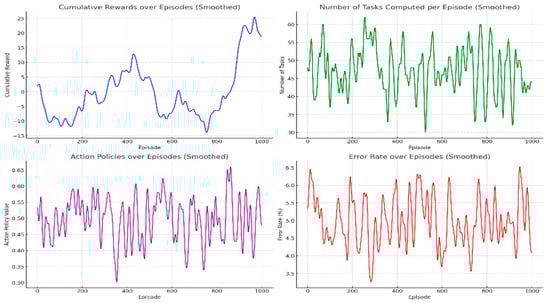 Figure 15 presents the performance metrics for the reinforcement learning (RL) model in the ARMO framework. The metrics include cumulative rewards, number of tasks computed per episode, action policies, and error rate over episodes.