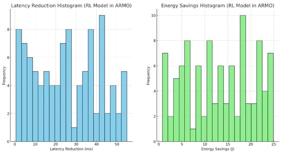 Figure 16 displays the histogram results for the RL model’s performance in ARMO, showing latency reduction and energy savings distributions.
