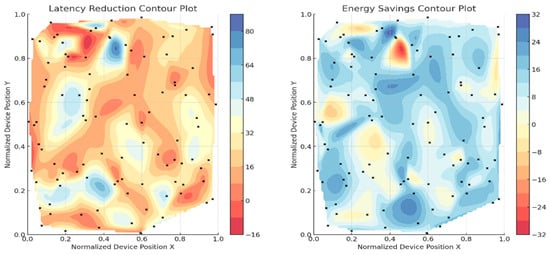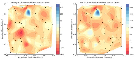 Figure 18 presents the contour plots for energy consumption and the task completion rate in edge computing with 6G and IoT devices.