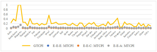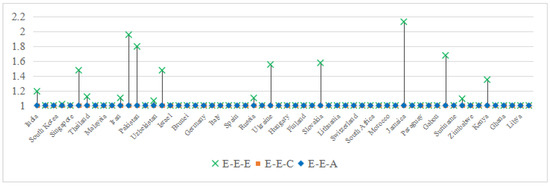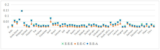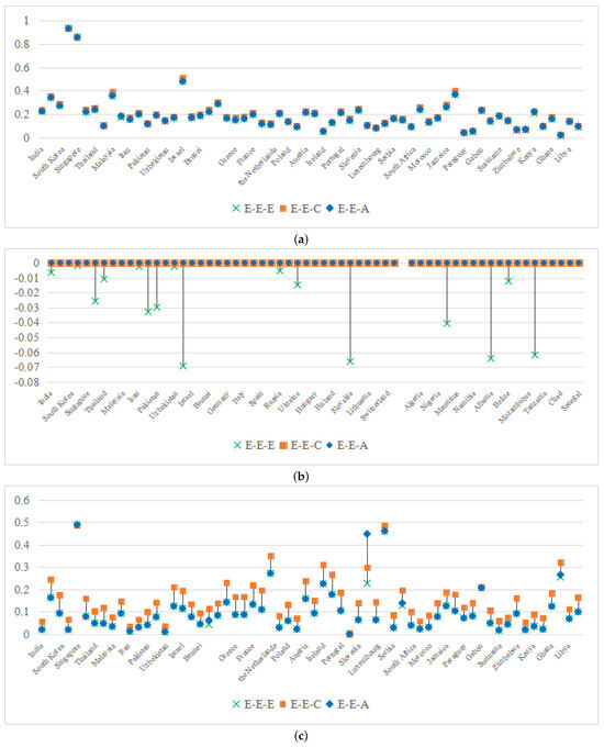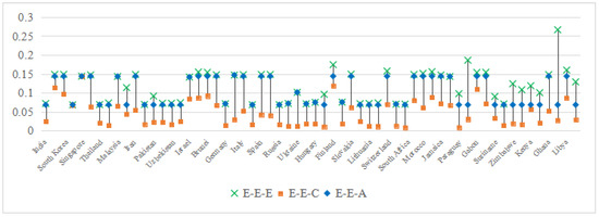 Europe’s tertiary sector has the highest (0.154 under E-E-C), driven by policy fragmentation in service industries (e.g., Lithuania’s due to uneven adoption of green logistics). In contrast, Africa’s low (0.130) stems from uniformly underdeveloped infrastructure ( air passengers in Mozambique). Notably, E-E-E underestimates (0.096 vs. E-E-C’s 0.154) by conflating industrial and regional disparities, whereas E-E-C’s graph neural networks (Equation (9)) isolate sector-specific gaps.
