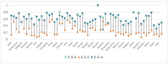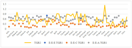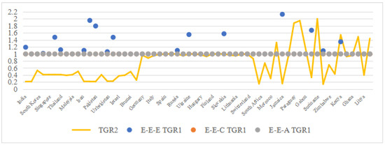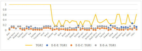 To statistically validate Hypothesis 1, we conducted a Wilcoxon signed-rank test comparing TGR distributions under E-E-E and E-E-C projections. For Hypothesis 2, Spearman’s rank correlation was computed between direction vector adjustments () and efficiency ranking shifts.