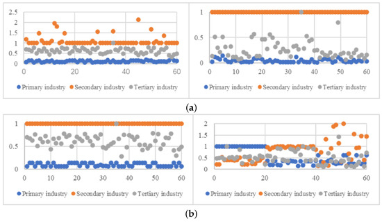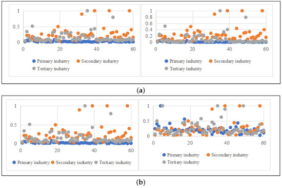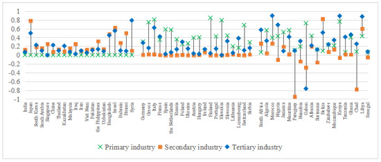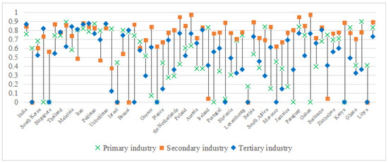 The average values across industries—primary (0.259) > tertiary (0.244) > secondary (0.088)—highlight the following: