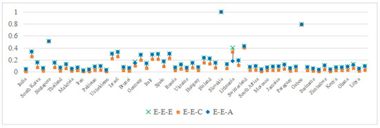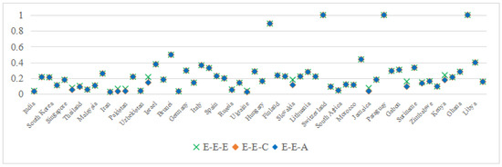 The secondary sector exhibits minimal industrial heterogeneity ( under E-E-C/E-E-A), as globalized manufacturing standards homogenize production technologies. However, the exogenous projection (E-E-E) produces invalid negative values (e.g., in China), a statistical artifact of . Machine learning-enhanced methods resolve this by constraining meta-frontier projections (Equations (15) and (16)), ensuring .