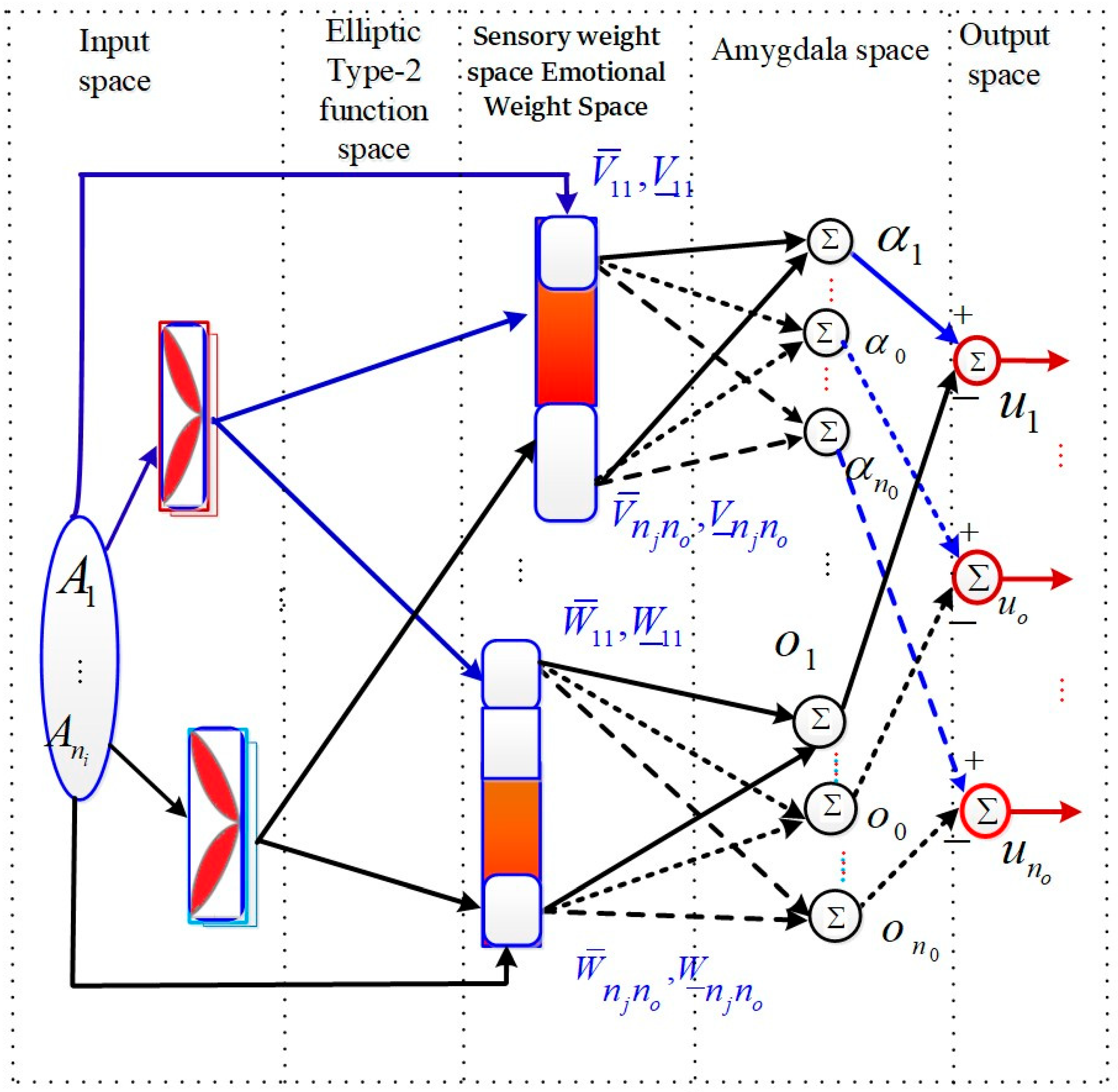 The transformed signals progress through the sensory weight space and emotional weight space, which emulate biological mechanisms of sensory evaluation and emotional modulation. The outputs of these layers are subsequently integrated within the amygdala and orbitofrontal cortex sub-output spaces, representing brain-inspired structures responsible for adaptive decision-making. Finally, the output space synthesizes the overall neural response to generate the control input for the underactuated mechanical system.