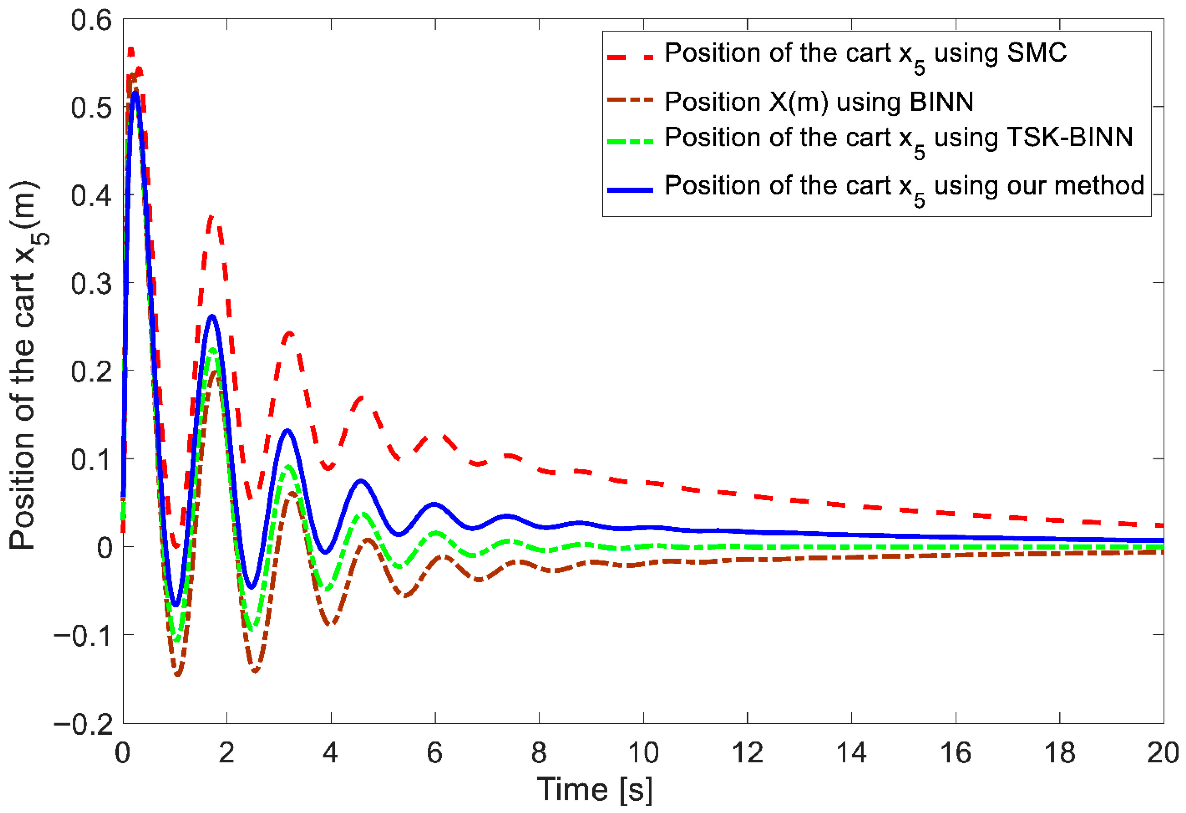 55], achieving a reduction factor of 0.1631/0.1552 = 1.0509. These results clearly demonstrate the superior accuracy and effectiveness of the proposed approach for controlling underactuated nonlinear systems.
