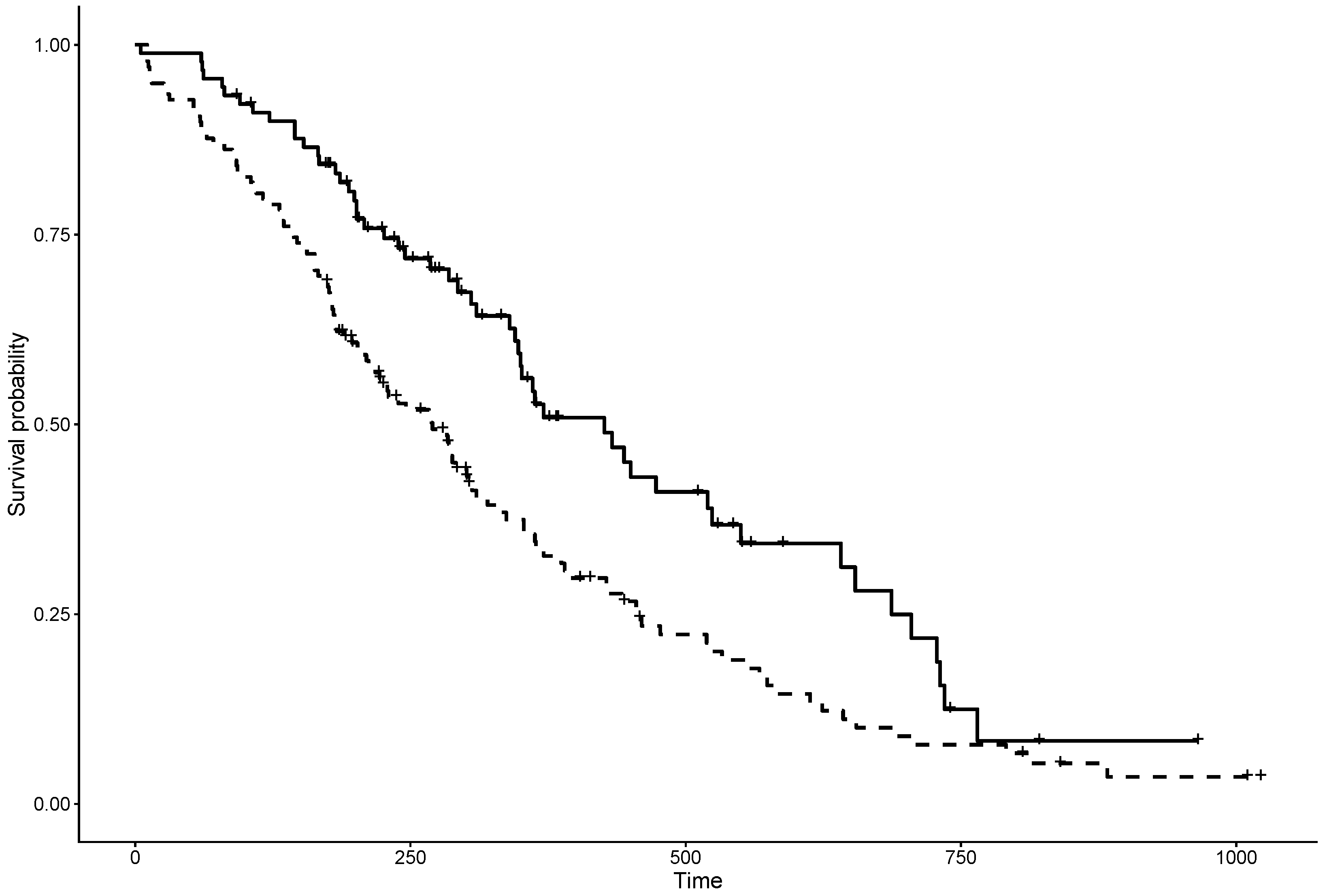 14], which compared the survival of patients with locally advanced gastric carcinoma under two treatment arms: chemotherapy alone (5-fluorouracil and semustine), which we consider the control group, versus chemotherapy combined with radiation therapy. This dataset is particularly relevant because the survival curves of the two groups exhibit a visual intersection at approximately 900 days (see