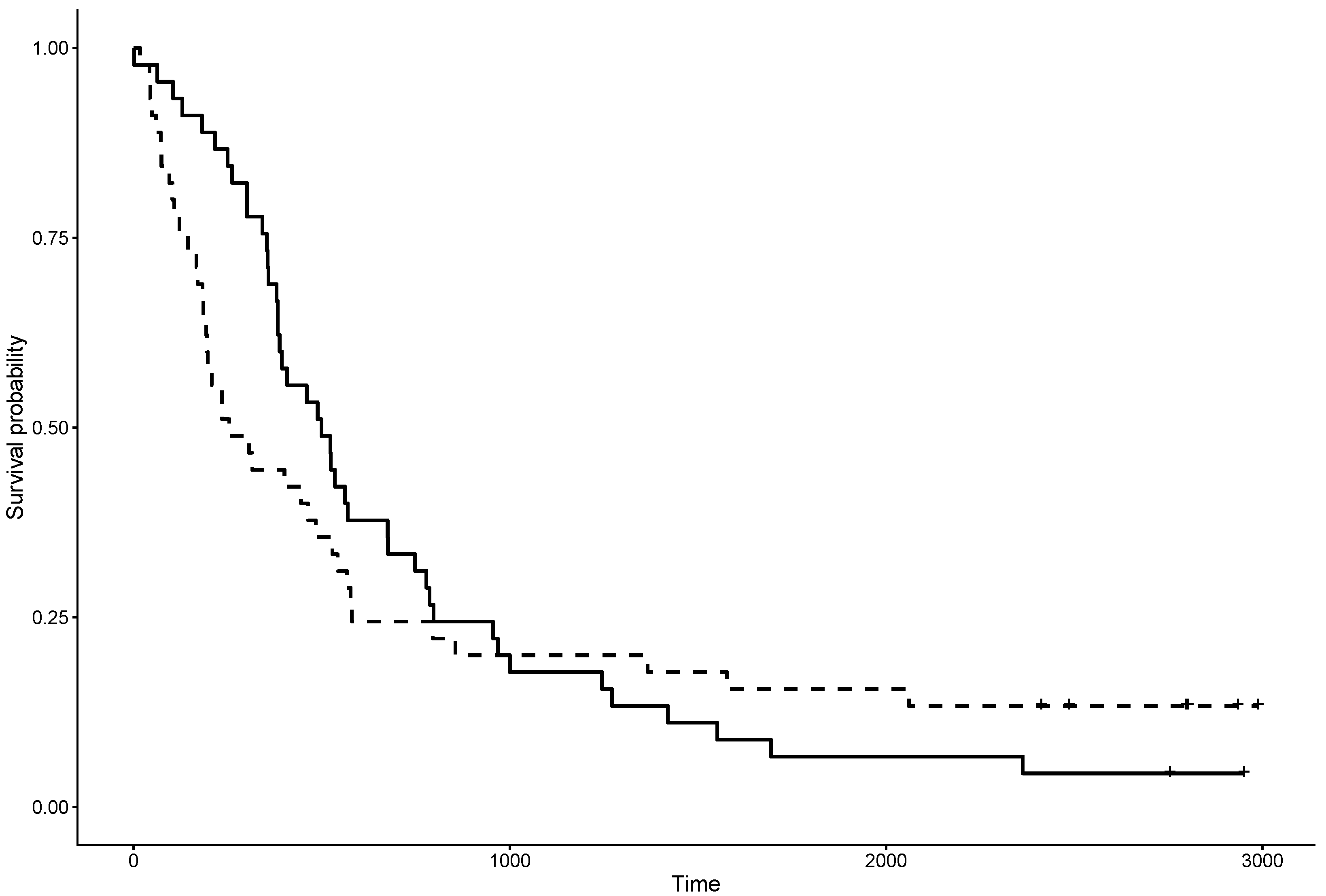 Figure 2). Before this point, the chemotherapy group appears to show higher survival probabilities, but the trend reverses thereafter.