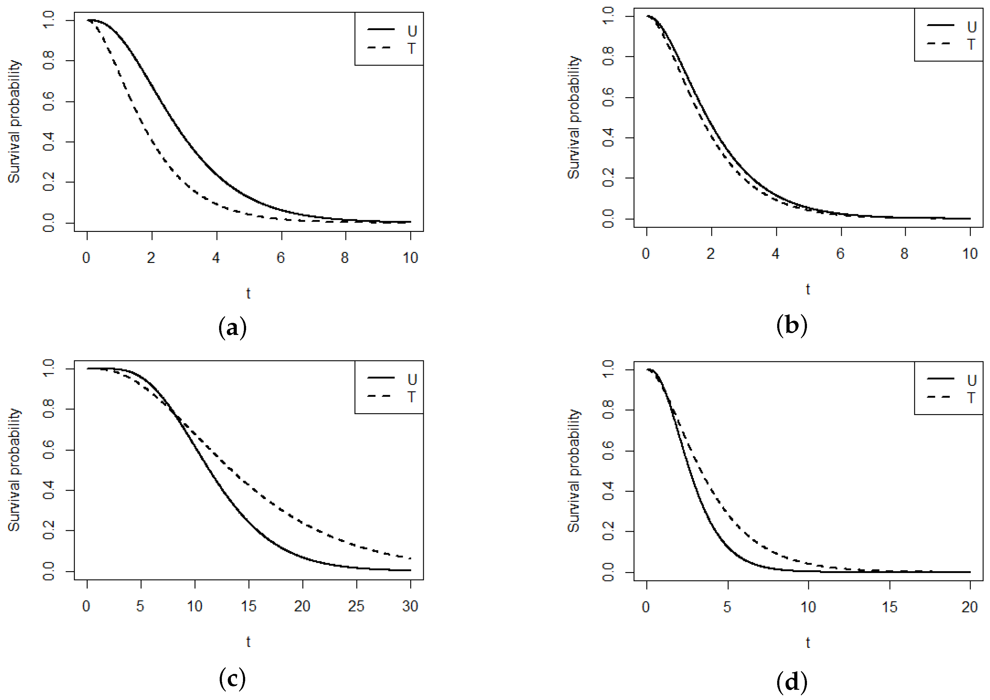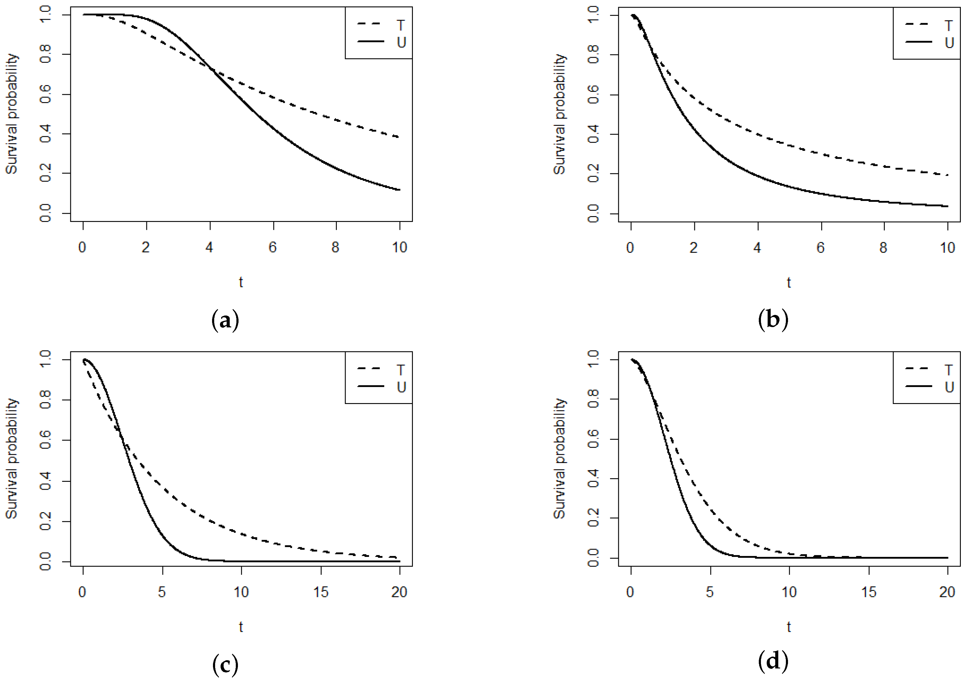 Case 2: In this case and . It is known that in this case, the survival function of U dominates the survival function of T, but they are very close.