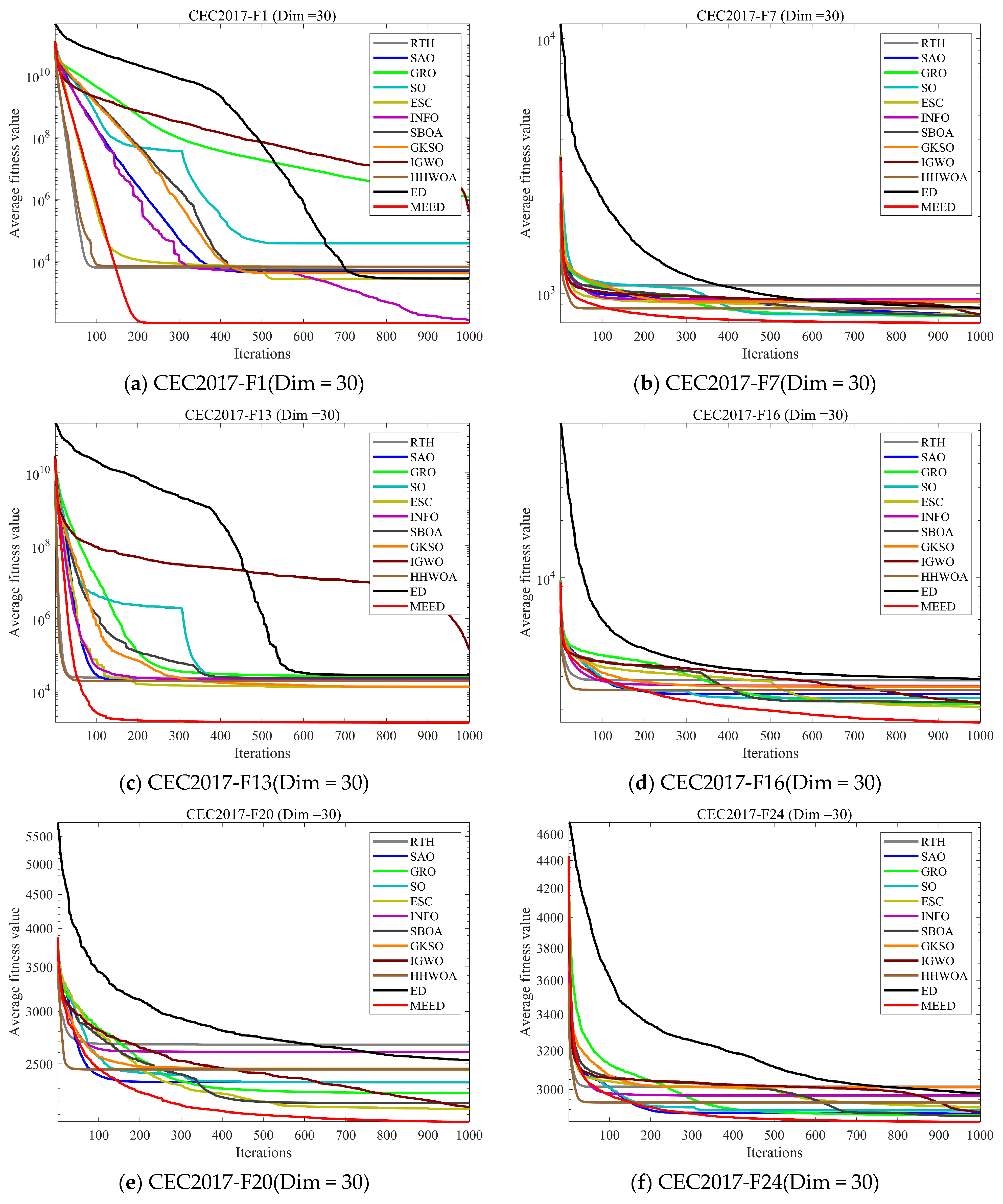 Performance analysis under dim = 30: The convergence curves of MEED and the comparison algorithms on six representative CEC2017 benchmark functions (F1, F7, F13, F16, F20, and F24) demonstrate that MEED achieves a significantly faster and more stable convergence process. In unimodal functions such as F1 and F7, MEED rapidly approaches the global optimum within the early stages of iteration, indicating its superior exploitation capability and convergence efficiency. For complex multimodal functions (e.g., F13 and F16), MEED consistently maintains lower average fitness values than other algorithms throughout the optimization process, proving its strong robustness and ability to escape local optima. Furthermore, in hybrid and composite functions such as F20 and F24, MEED still exhibits excellent convergence stability and solution precision, whereas most comparison algorithms show oscillation or premature convergence. These results collectively confirm that the integration of multi-strategy mechanisms in MEED significantly improves both the global exploration ability and local exploitation accuracy, leading to overall superior optimization performance.