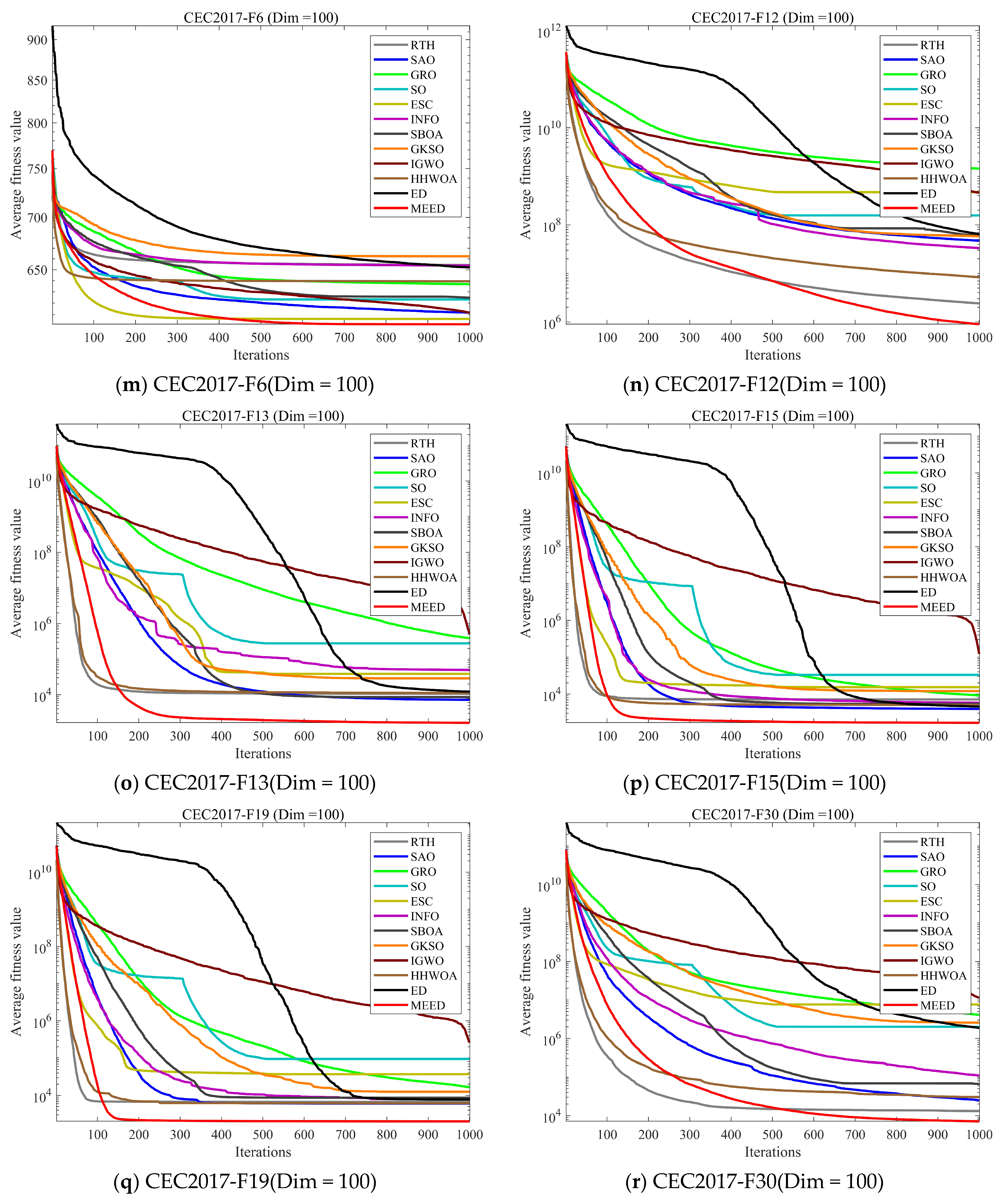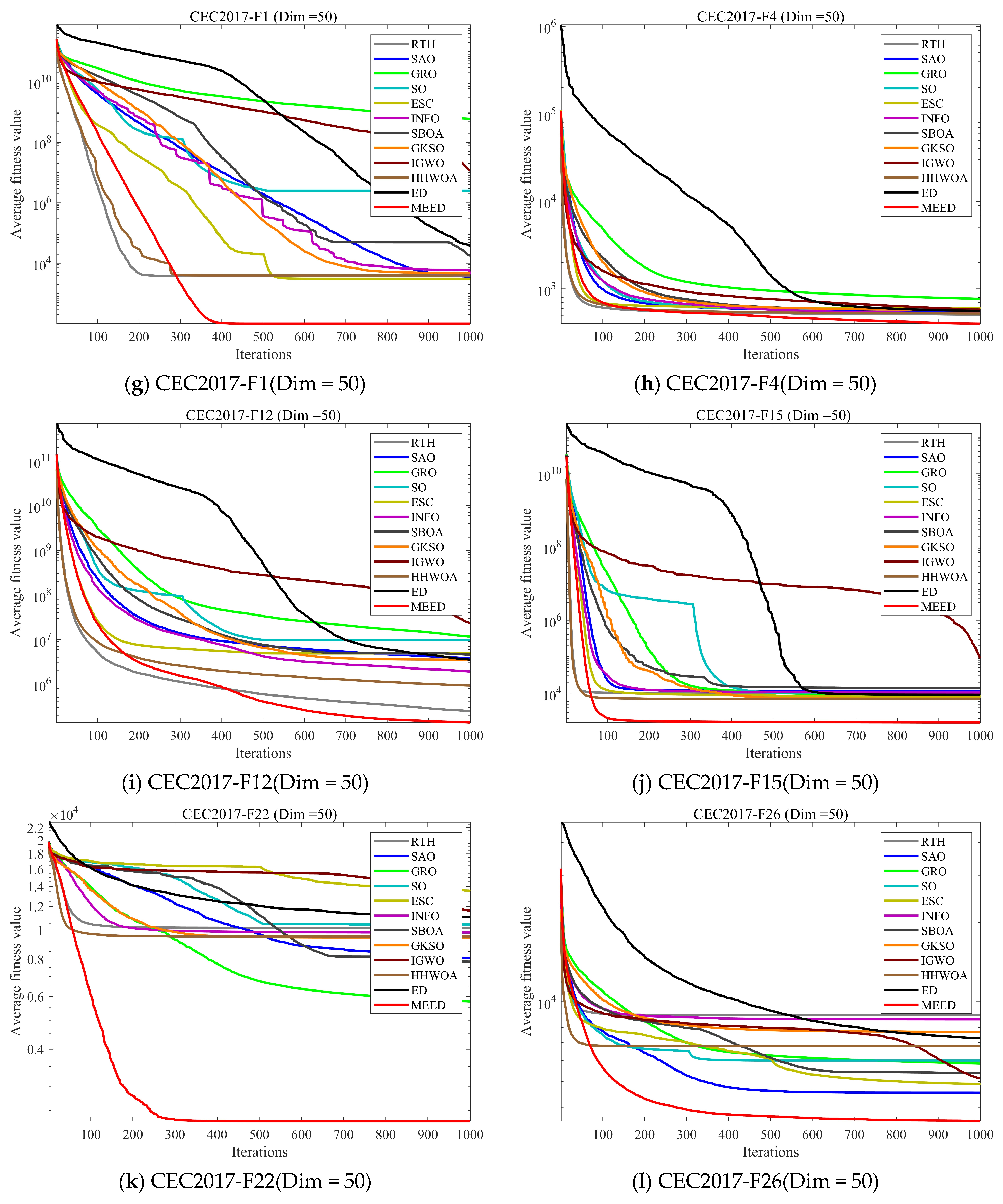 In this subsection, we evaluate the performance of MEED using the CEC2017 test set. We compare MEED against 11 other state-of-the-art algorithms across three dimensionality levels: 30, 50, and 100 dimensions. The convergence curves for each algorithm are shown in