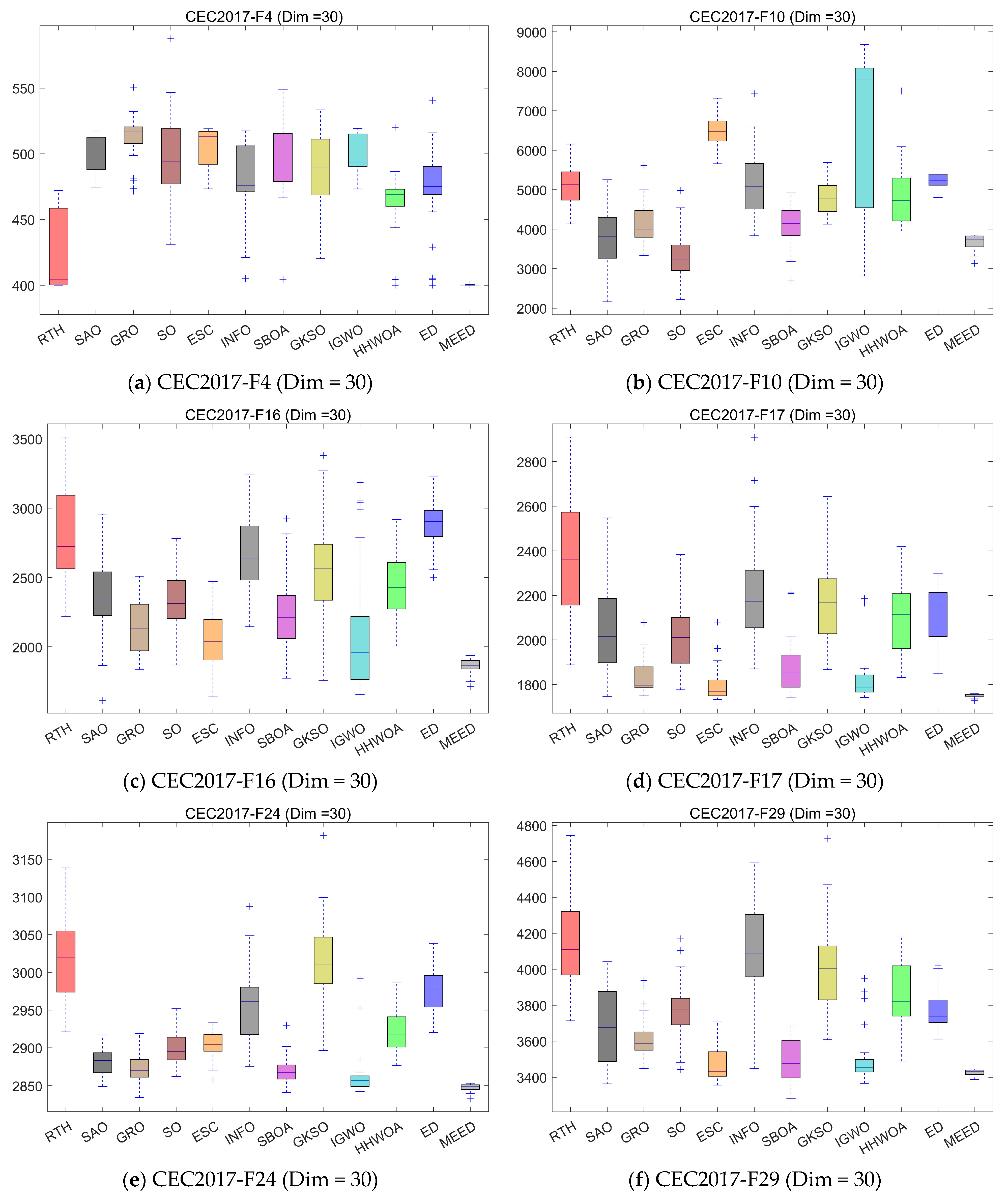 Table 4. Here, “mean” represents the mean of 30 runs, and “std” represents the standard deviation of 30 runs. To provide a comprehensive analysis of the algorithms, box plots of experimental results from 30 runs are displayed in