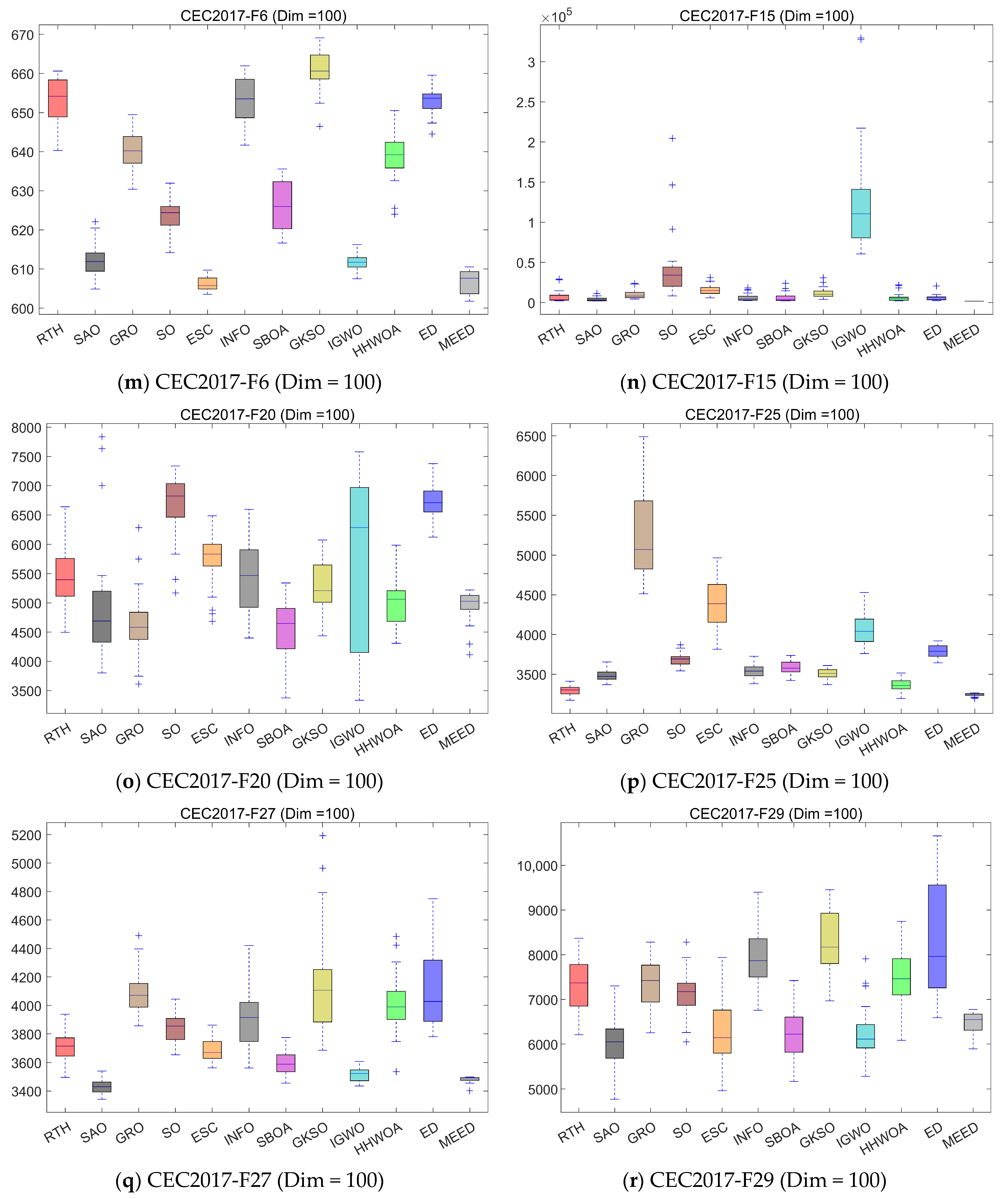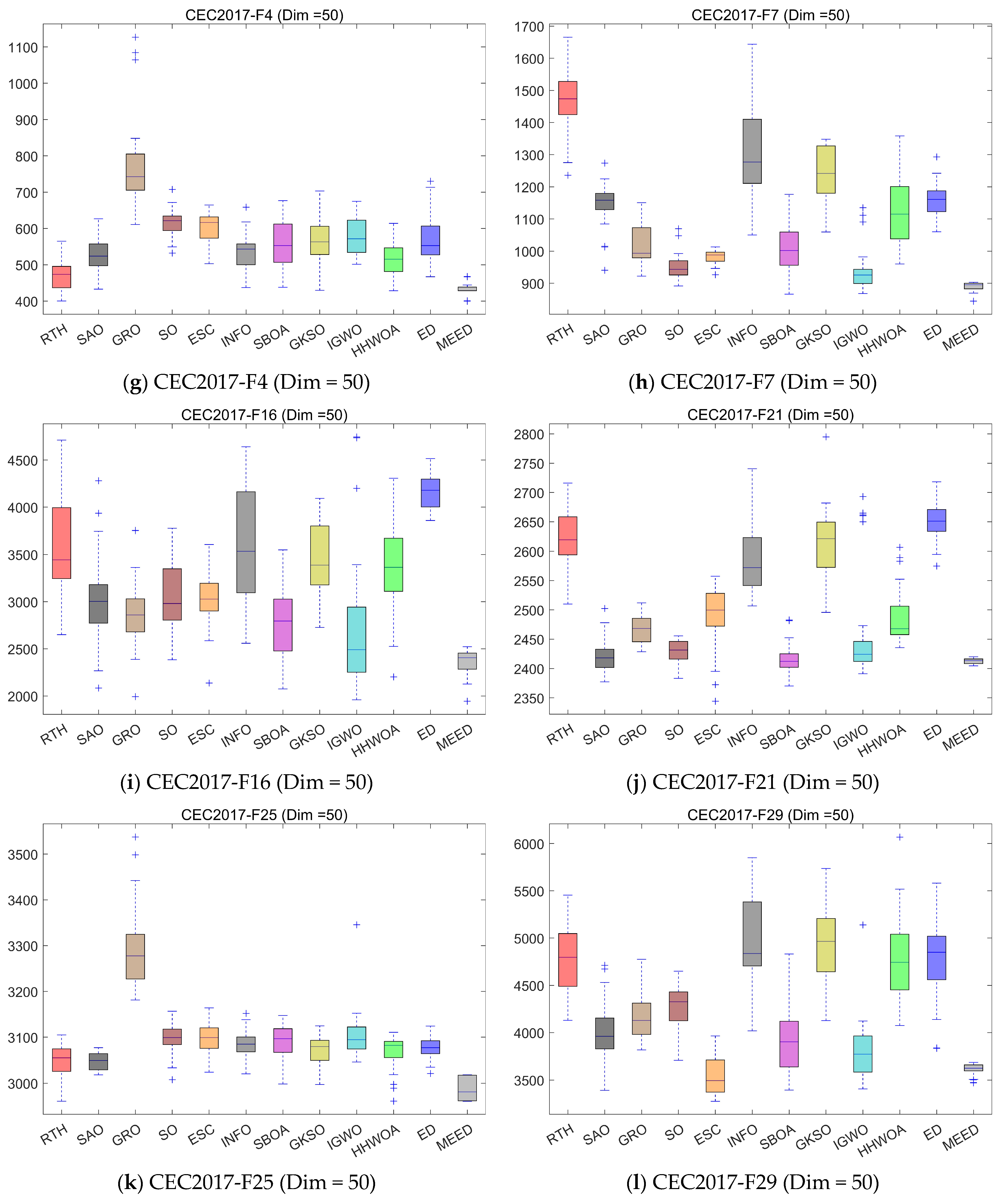 Performance analysis under dim = 50: The convergence curves of all algorithms on six representative CEC2017 benchmark functions (F1, F4, F12, F15, F22, and F26) under 50-dimensional conditions further validate the superior optimization capability of MEED. It can be clearly observed that MEED achieves the fastest convergence rate and the lowest final fitness values across almost all test functions. Specifically, in unimodal functions such as F1 and F4, MEED rapidly converges to the global optimum within the first few hundred iterations, demonstrating excellent exploitation ability. In complex multimodal and hybrid functions (e.g., F12, F15, and F22), MEED consistently outperforms other algorithms, showing a strong capacity to escape from local optima and maintain high convergence stability. Even in the highly composite function F26, which presents numerous local minima and rugged landscapes, MEED still achieves the best convergence precision with a smooth and stable descent curve, while other algorithms exhibit stagnation or oscillation behaviors. These results indicate that MEED possesses superior robustness and scalability when addressing high-dimensional and complex optimization tasks. The incorporation of multi-strategy mechanisms enables MEED to balance exploration and exploitation effectively, thereby maintaining high search efficiency even in challenging large-scale optimization scenarios.