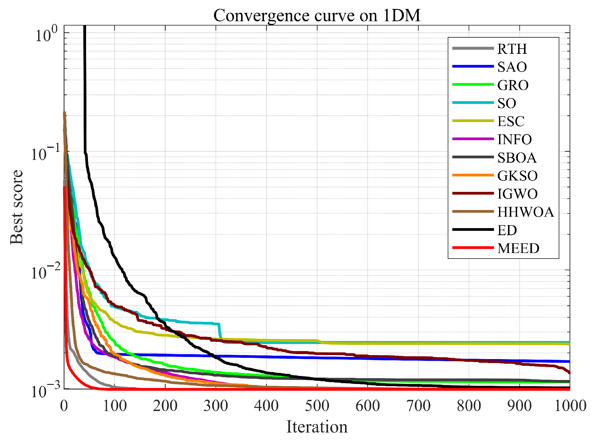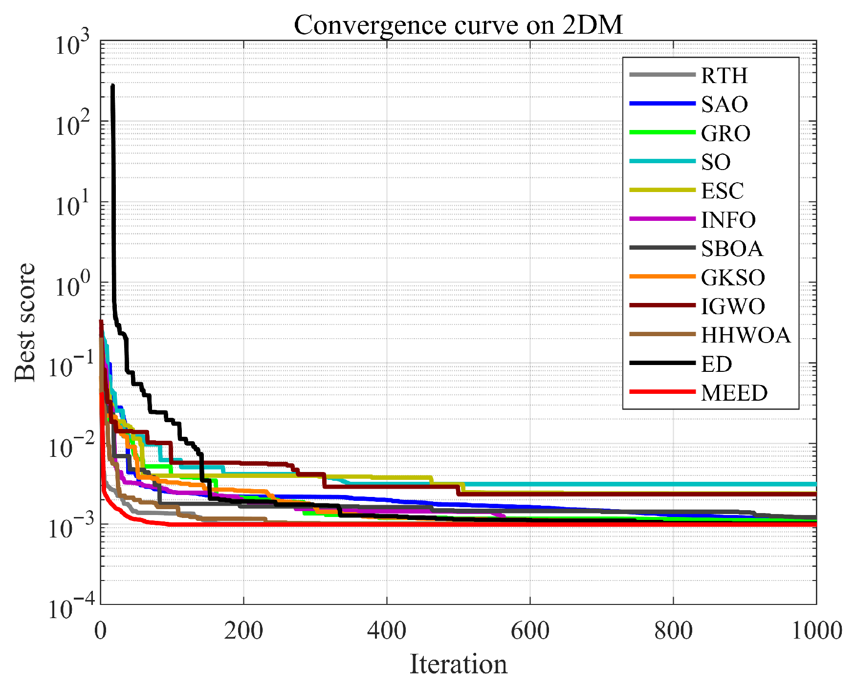 In this section, the superior performance of the proposed MEED algorithm is validated through comparative experiments with 11 state-of-the-art algorithms, including the Red-tailed Hawk Algorithm (RTH), Snow Ablation Optimizer (SAO), Gold Rush Optimizer (GRO), Snake Optimizer (SO), Escape Algorithm (ESC), weighted mean of vectors algorithm (INFO), Secretary Bird Optimization Algorithm (SBOA), Genghis Khan Shark Optimizer (GKSO), Improved Gray Wolf Optimizer (IGWO), hyper-heuristic whale optimization algorithm (HHWOA), and the standard enterprise development algorithm (ED). To enhance the reproducibility of the experiments,