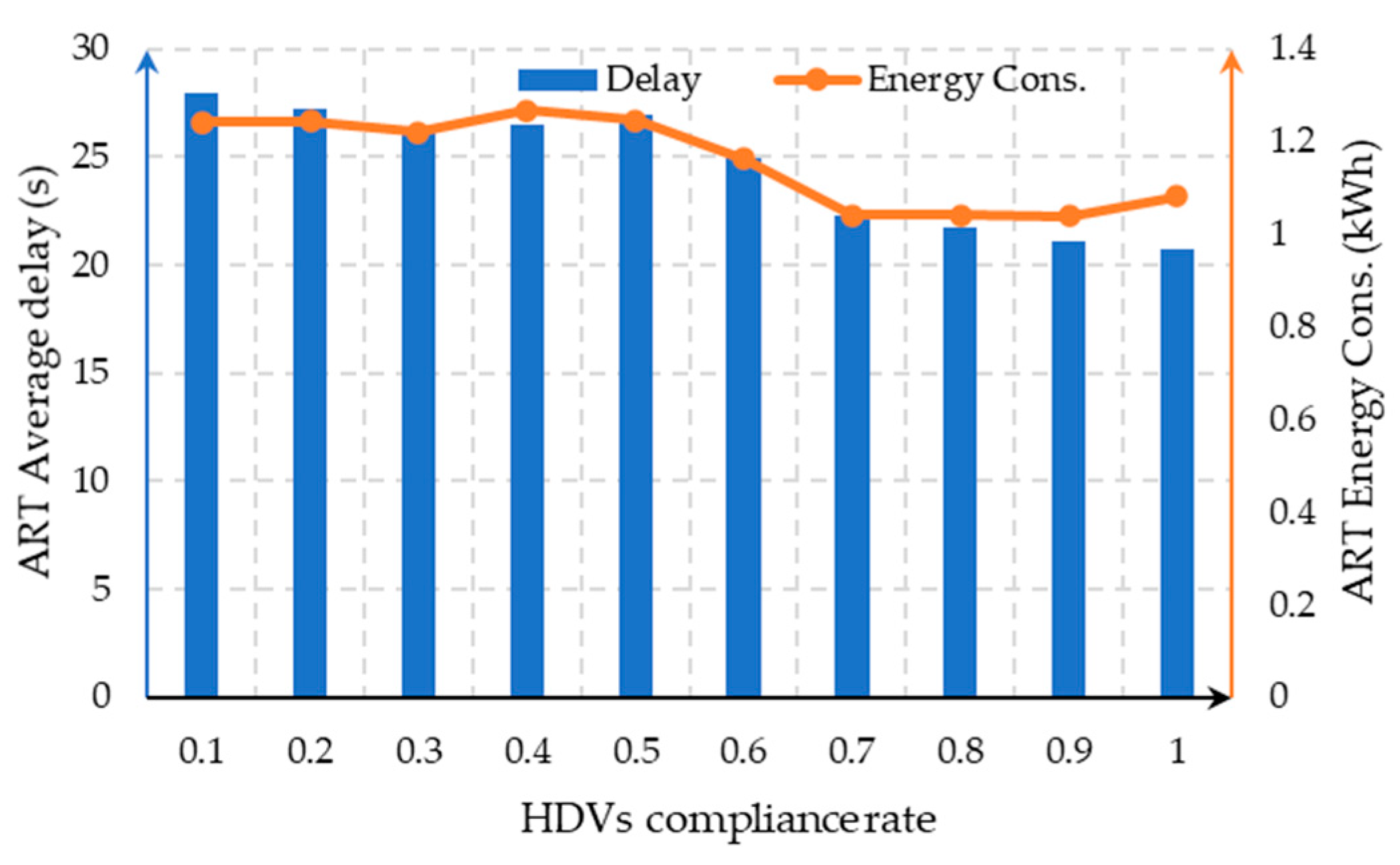 - The compliance behavior of non-ART vehicles is analyzed. A key challenge in lane-sharing scenarios is the compliance of non-ART vehicles with block control rules. Simulation results show that when the compliance rate of non-ART vehicles exceeds 60%, ART operational efficiency is largely maintained.