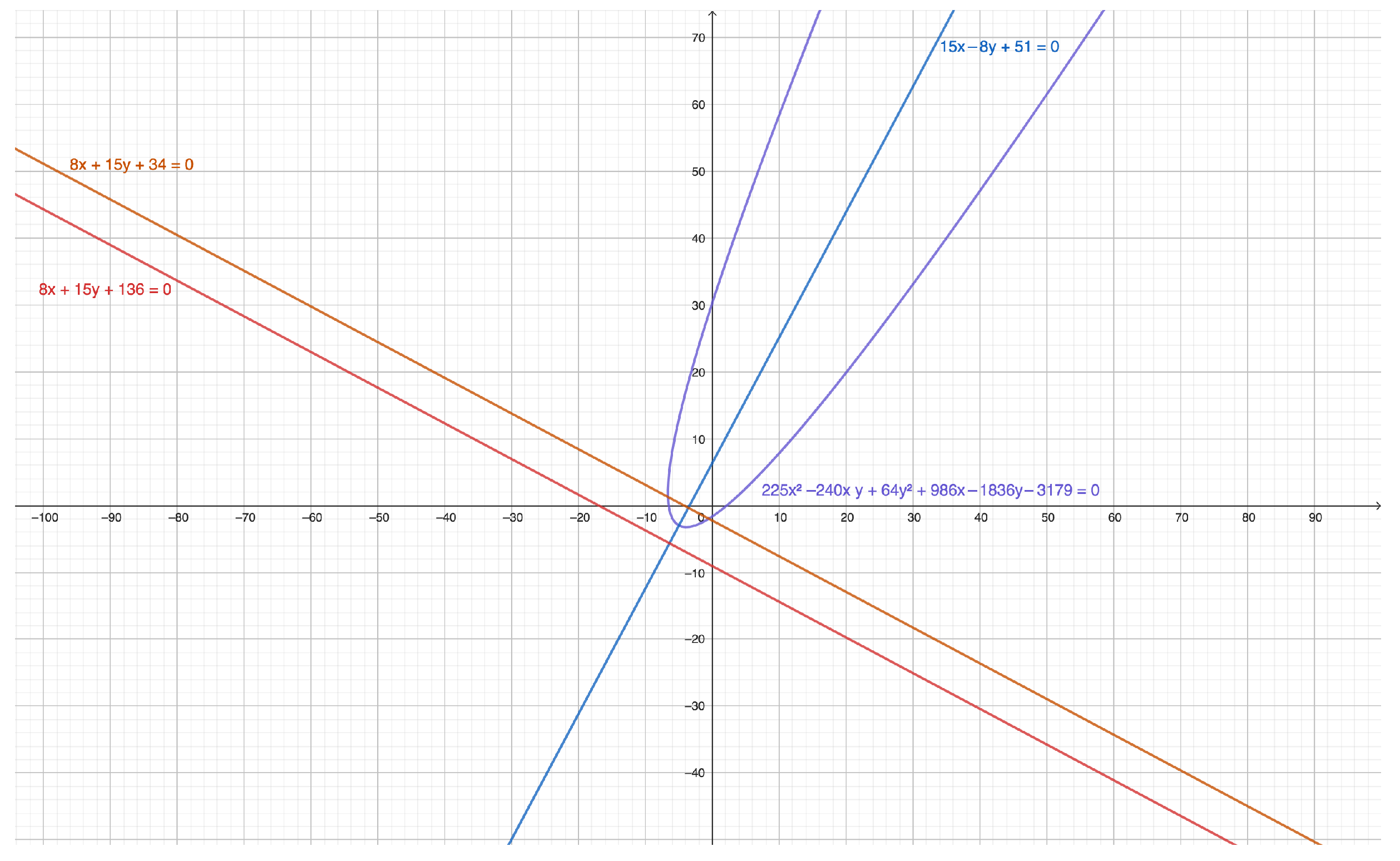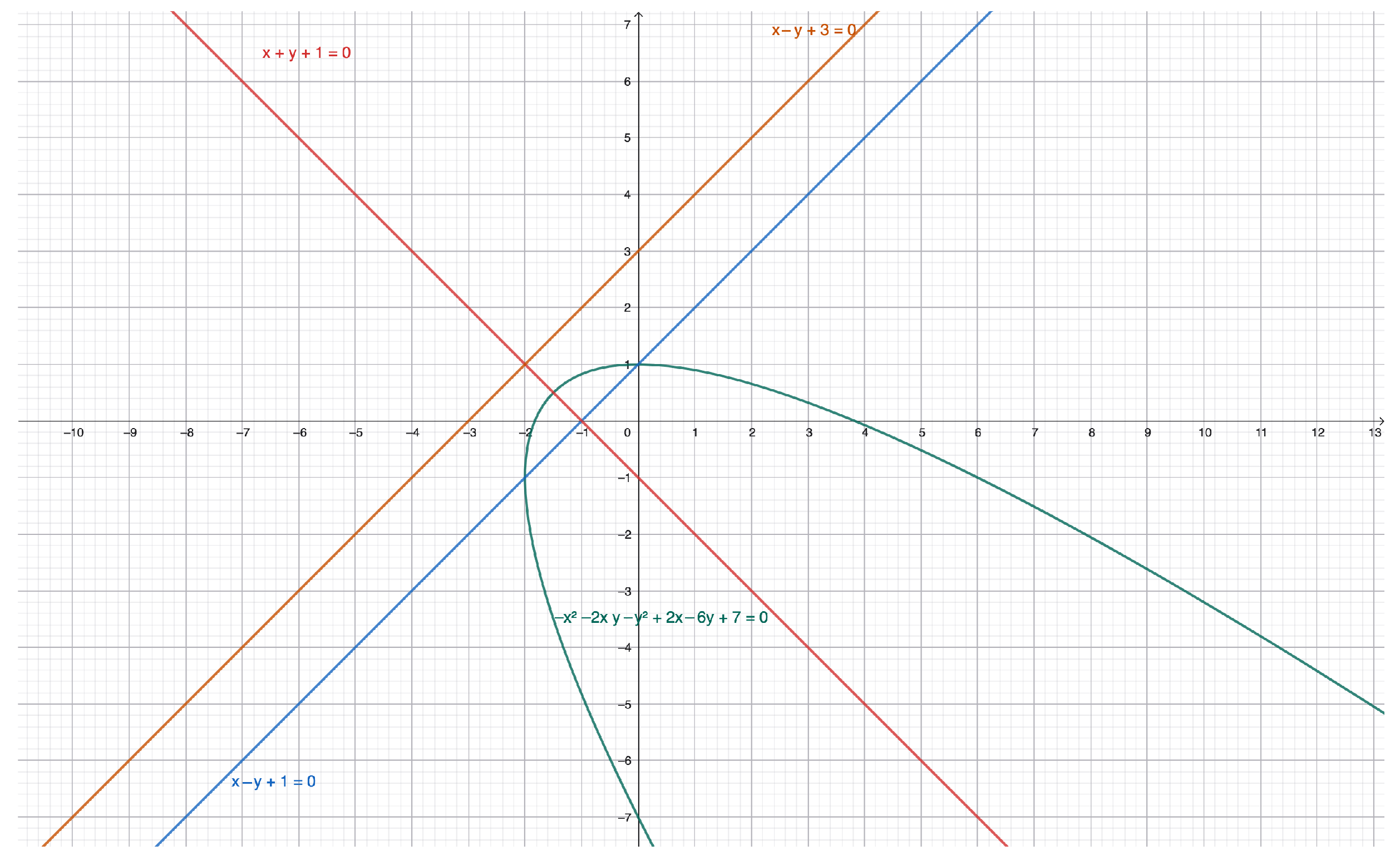 - If and the locus in question corresponds to a non-degenerate parabola, then whenever the equation of this parabola without rotations and translations is given byso, whenever the equation of this parabola without rotations and translations is given bywhere and correspond to the Cartesian axes generated by a rotation and a translation at the same time, for some angle and some translated origin .