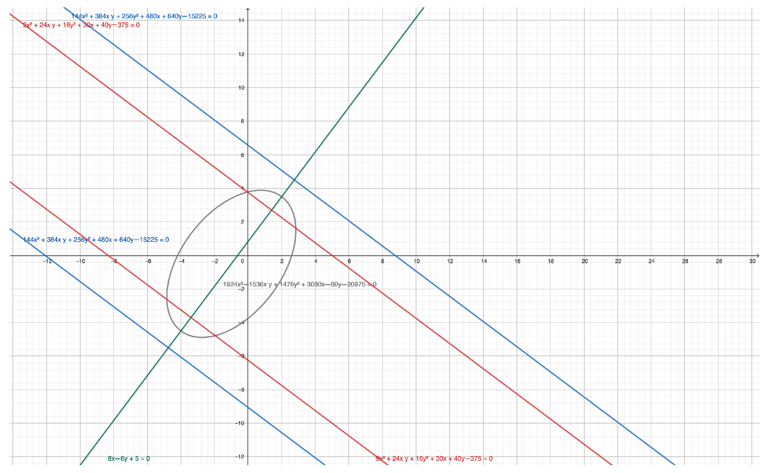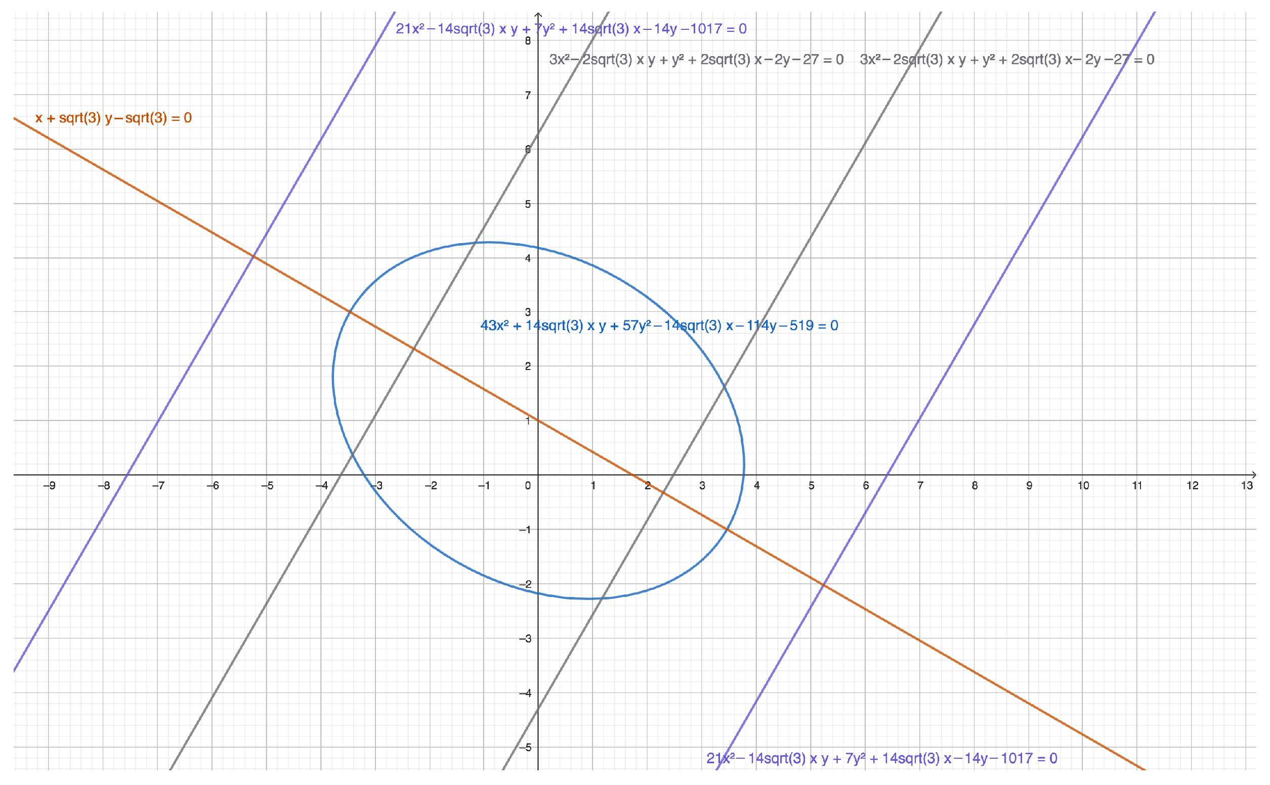 - Suppose that , so if and are the coordinates of the central point of the ellipse on the rotated Cartesian plane, then Corollary 12(i) and Theorem 7(ii) guarantee that the focal axis of the ellipse is horizontal with respect to the rotated Cartesian plane, thus . Hence, (6)–(8), (15), (16), (18), and Lemma 7(ii) imply