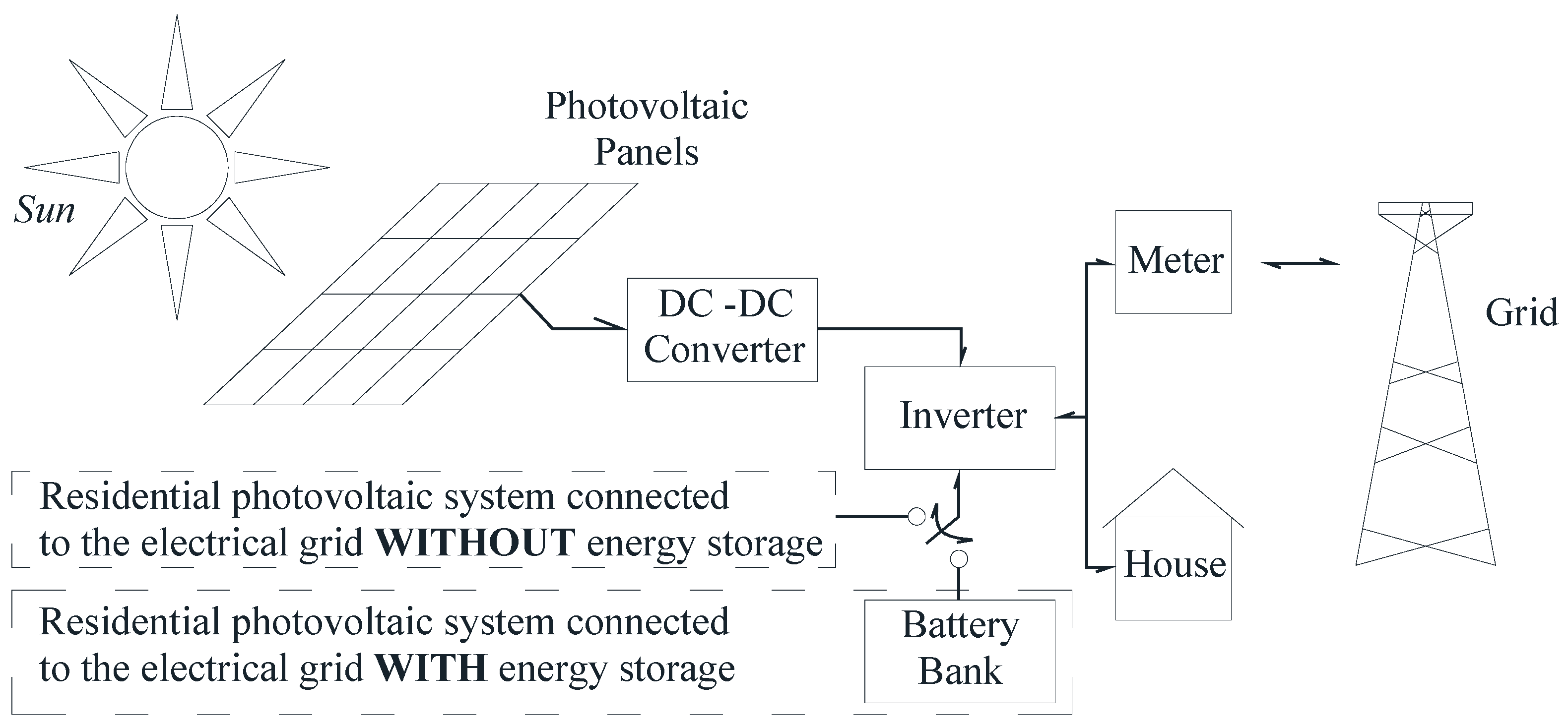 Figure 12, we can see and approximate that the power delivered by the PV system is symmetrical throughout the days. With this consideration, the power delivered can be modeled as a half-period sinusoidal signal with a peak of 1600 W. To calculate the energy delivered in a day, the average sinusoidal power function is integrated with the time reference in hours. This calculation results in a daily energy output of 12.2 KWh.