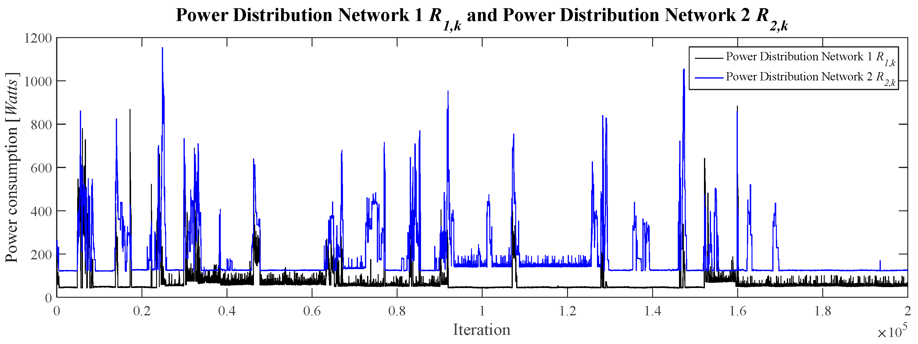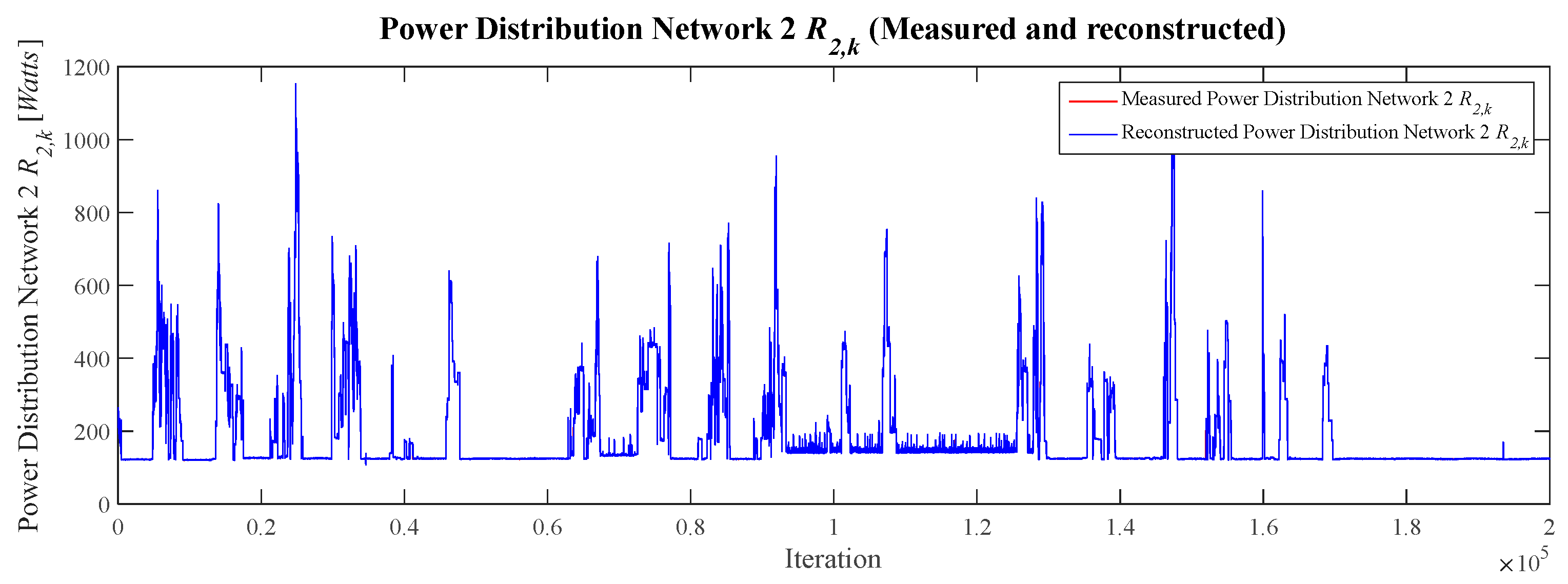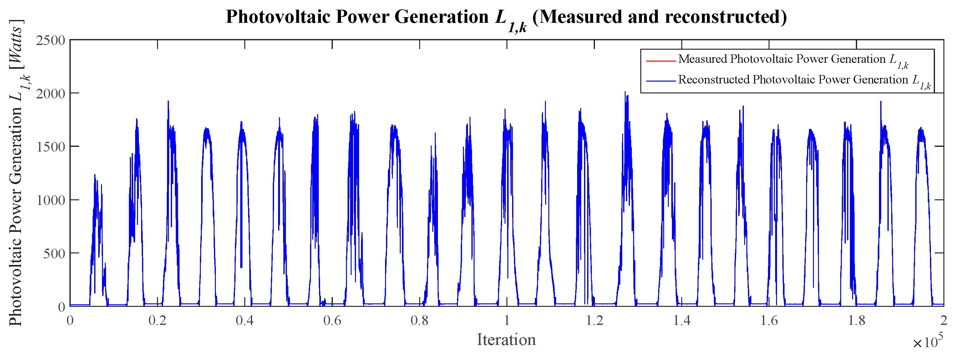 Once linear independence of the noises associated with input system and output system was ensured, the Kalman filter was used as one part of a reconstructor of electrical parameters SE,k of a monitoring IoT system of electrical parameters. For this reason, it was necessary to analyze the covariance of input noise and the covariance of output noise in PV Power Generation L1,k, Power Distribution Network 1 R1,k, and Power Distribution Network 2 R2,k. Then it is possible to use Equation (7) to calculate the Kalman’s gain , which will allow the reconstruction of PV Power Generation L1,k, Power Distribution Network 1 R1,k, and Power Distribution Network 2 R2,k.