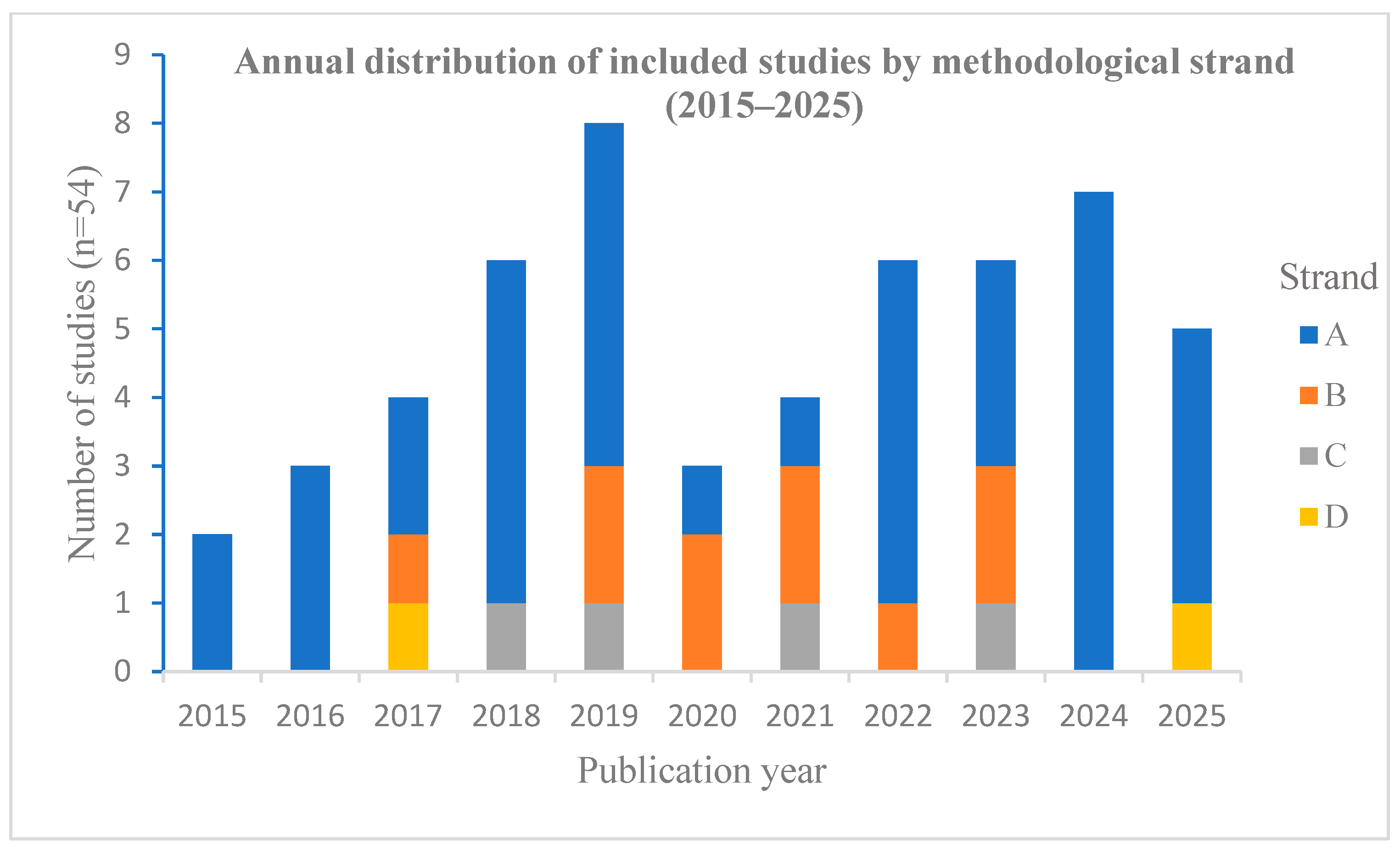 | B5 Outcomes/metrics | 4 (7.4) | 27 (50.0) | 23 (42.6) |