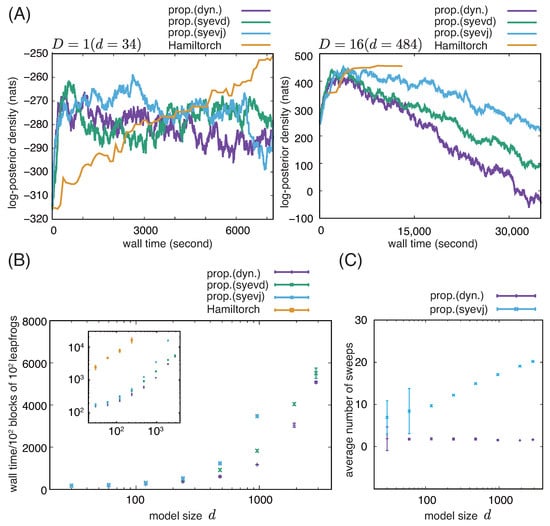 RMHMC for Bayesian logistic regression on simulated data. Comparison between our implementations based on the dynamic and static eigendecomposition of the Hessian and the implementation based on Hamiltorch. (A) Representative trajectories of log posterior density for () and (). (B) Mean and standard deviation of the wall time spent on computing 100 blocks of 100 leapfrogs are shown on the linear (main panel) and logarithmic (inset) scales for different model sizes. (C) Mean and standard deviation of the number of sweeps in the cyclic Jacobi method for a single dynamic and static eigendecomposition of the metric are shown on the logarithmic scale for different model sizes. In (B,C), model sizes are shown on the logarithmic scales. (Abbreviations) prop.(dyn.): the proposed method based on dynamic eigendecomposition, prop.(syevd): the proposed method based on static eigendecomposition with the divide-and-conquer algorithm, and prop.(syevj): the proposed method based on static eigendecomposition with the Jacobi method.