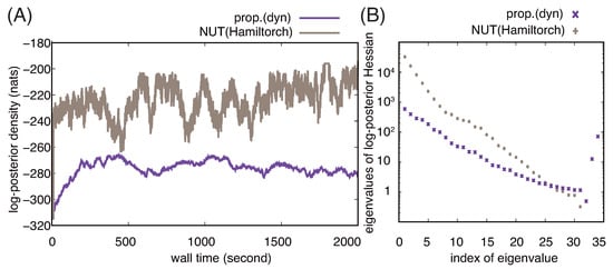 Comparison of proposed implementation of RMHMC and NUT-HMC in Hamiltorch. (A) Representative trajectories of the log posterior density for () obtained using the proposed implementation of RMHMC based on dynamic eigendecomposition (prop.(dyn)) and NUT-HMC in Hamiltorch. (B) Eigenvalues of the Hessians of the negative log posterior density for the samples of parameter values obtained after running the proposed implementation of RMHMC and NUT-HMC in Hamiltorch for 2000 s. The eigenvalues are plotted in descending order on the logarithmic scale. For negative eigenvalues, their absolute values are plotted. The absolute values of the 32nd to 34th eigenvalues for the sample from NUT-HMC were extremely small and are therefore out of the range in the plot.