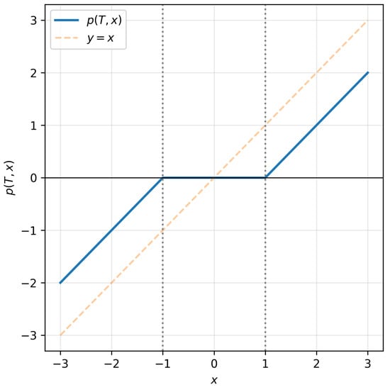 The function corresponds to the classical soft-thresholding rule (Figure 1). It continuously shrinks small-magnitude observations toward zero while preserving larger coefficients. Such thresholding functions naturally arise as solutions of quadratic risk minimization problems and are widely used in sparse signal recovery and wavelet shrinkage due to their stability and favorable theoretical properties [16].