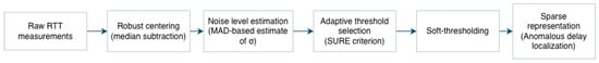 Schematic illustration of the data processing pipeline. Raw RTT measurements are centered using a robust location estimate, the noise level is estimated via a MAD-based procedure, an adaptive threshold is selected using the SURE criterion, and soft-thresholding is applied to obtain a sparse representation highlighting anomalous RTT components.