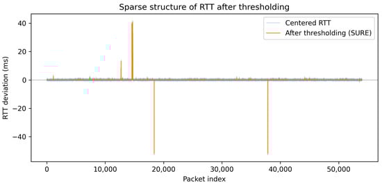 Sparse structure of RTT deviations after thresholding. The blue curve corresponds to centered RTT observations, while the orange curve shows the thresholded signal. Thresholding suppresses small-amplitude fluctuations attributed to noise, while preserving rare, high-magnitude deviations corresponding to anomalous network delays.