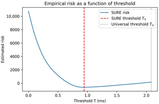 To demonstrate the adaptive threshold selection mechanism, we computed Stein’s unbiased risk estimate over a range of threshold values. The search was restricted to the interval , where