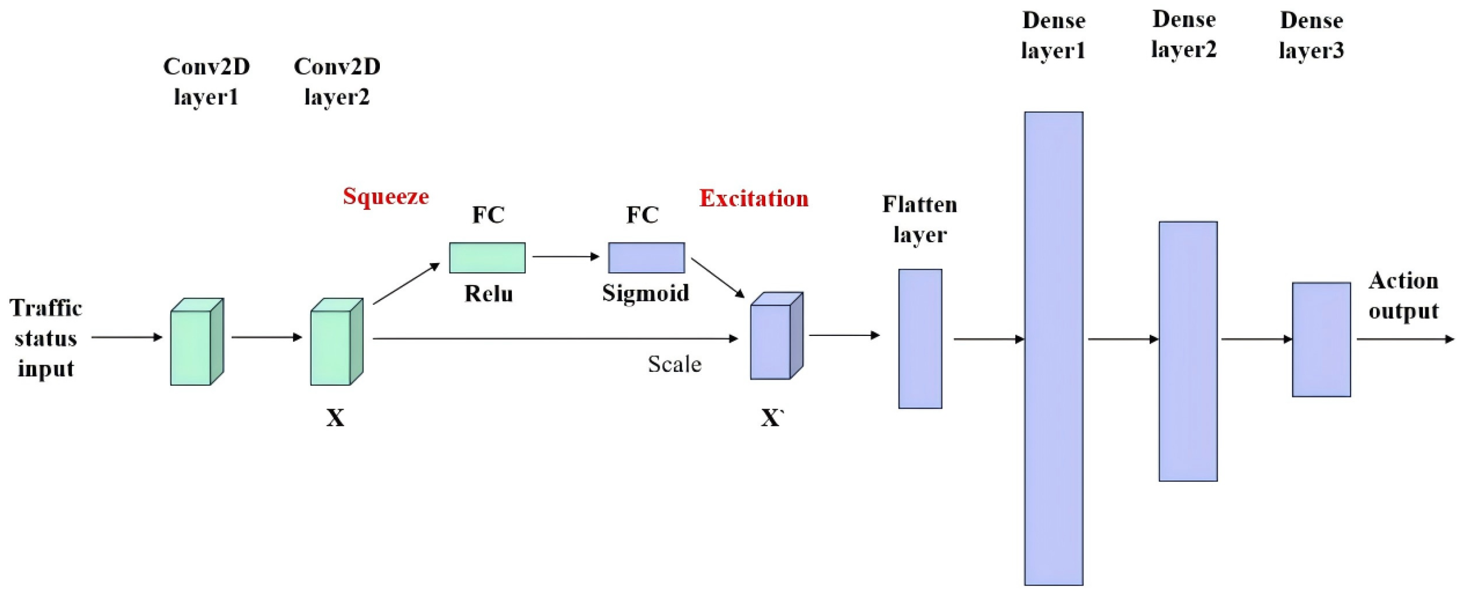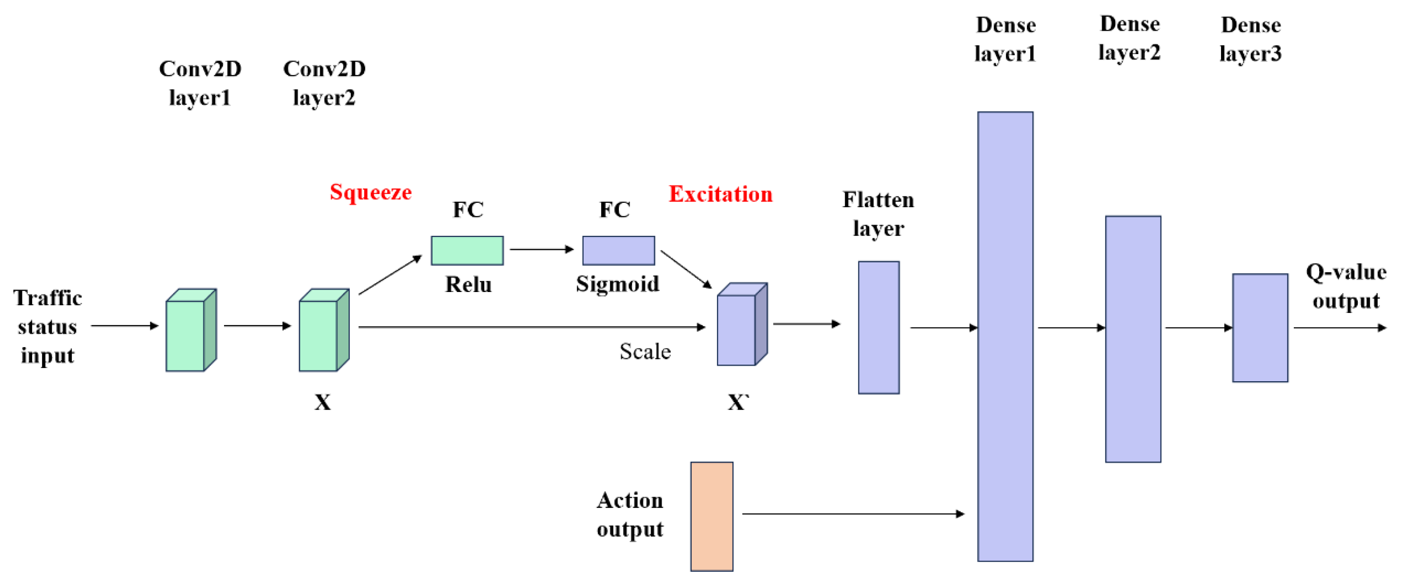 In this study, the SE module from SENet is introduced into both the Actor and Critic networks of the A3C algorithm, as shown in Figure 1. The structure of the Actor and Critic networks in the SE-A3C algorithm is designed as follows: In the input layer, the Actor network receives a position and speed matrix, while the Critic network’s input includes the position matrix, speed matrix, and the action. The input matrices pass through two convolutional layers for feature extraction, whereas the actions in the Critic network are fed directly into the fully connected layers. The extracted feature matrices are then processed by the SE module, where channel weights are computed and recalibrated. After recalibration, the feature matrices are flattened in the Flatten layer. Finally, fully connected layers are added to integrate and further extract features. All convolutional and fully connected layers use the ReLU activation function, while the final fully connected layer employs a linear activation function to output traffic signals that align with the action space. By incorporating the SE module, the SE-A3C algorithm not only improves the model’s stability and performance but also enhances the neural network’s ability to adapt to feature channels, enabling more effective capture and utilization of key traffic flow features.