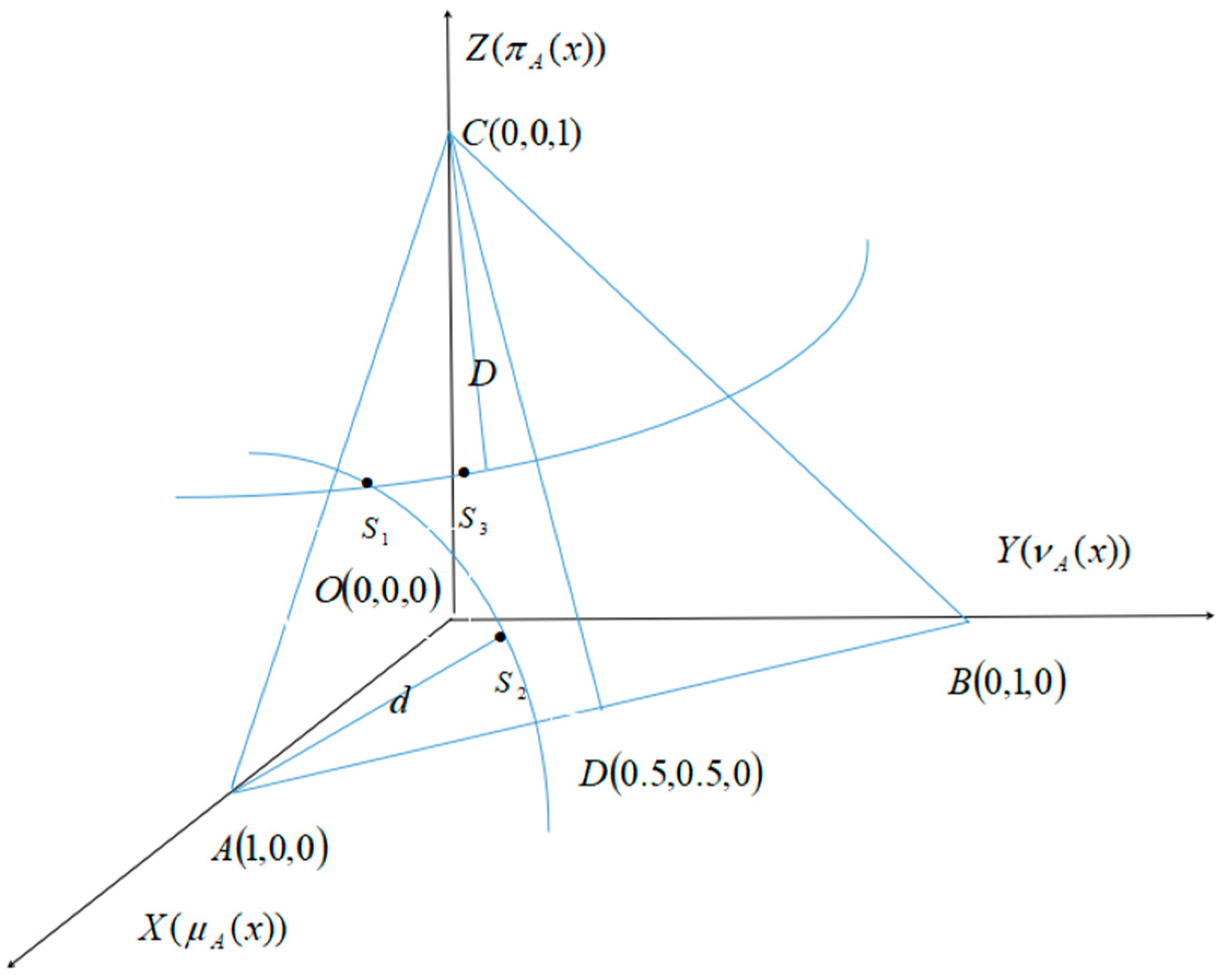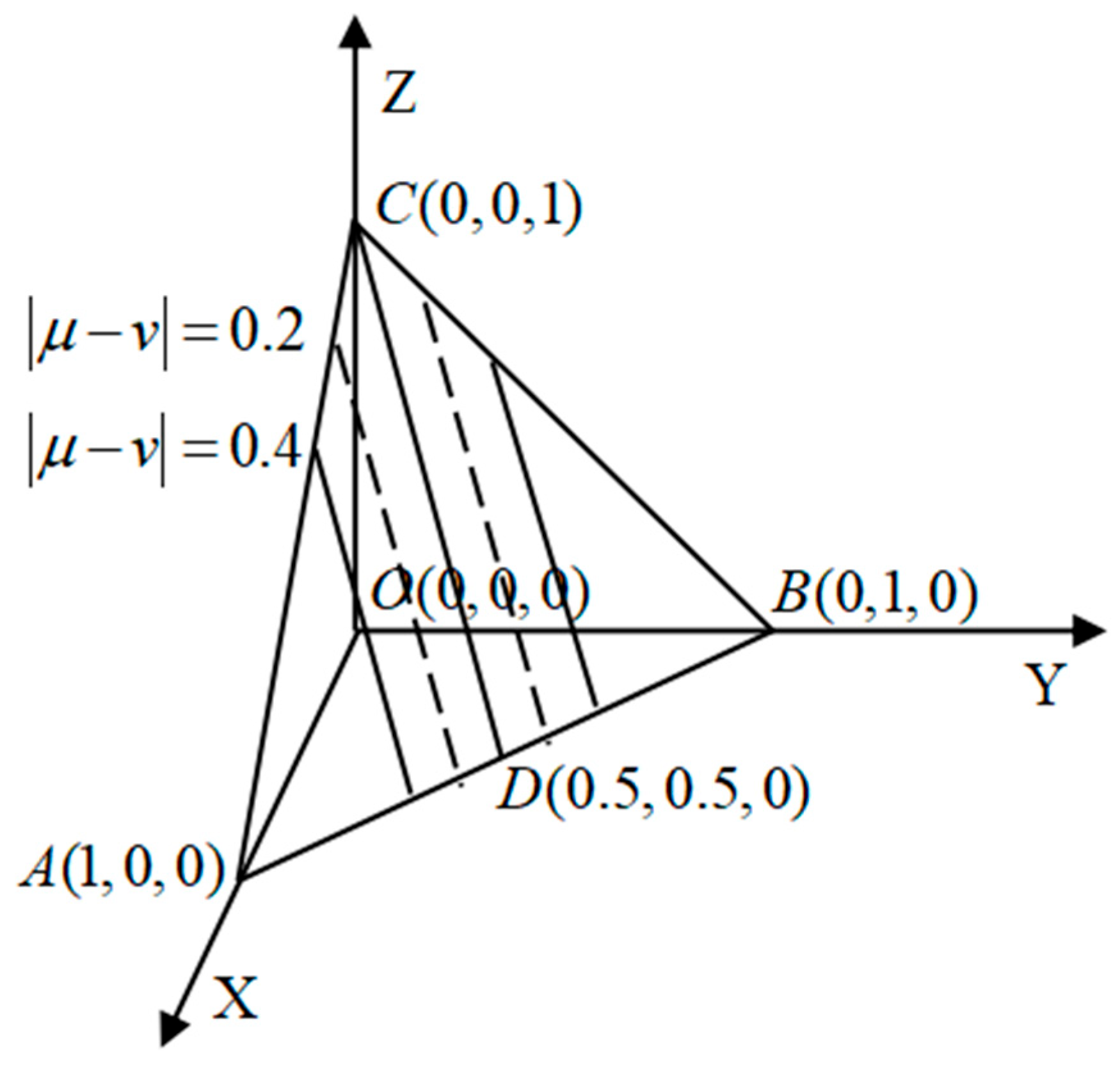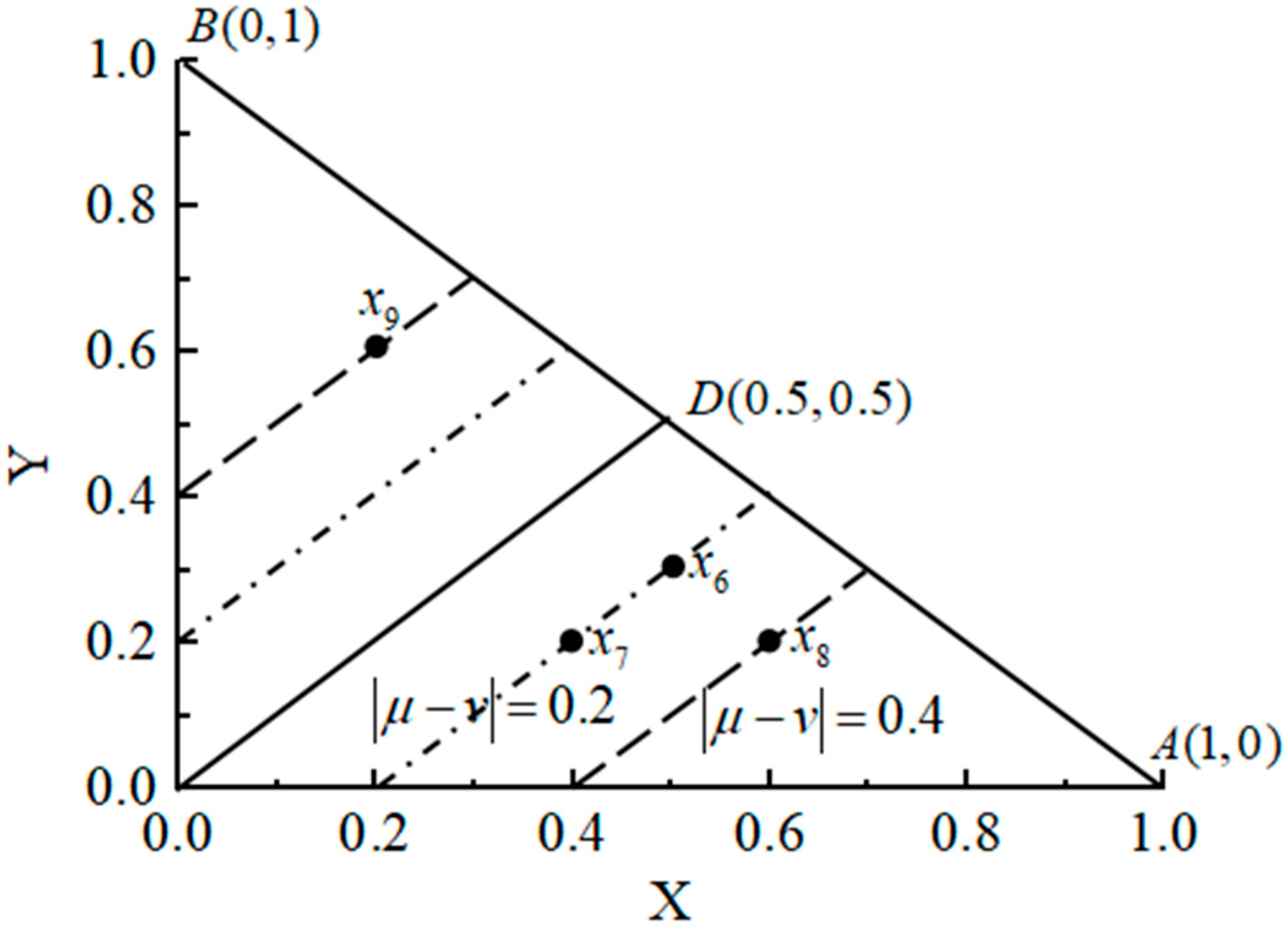 - Obviously, intuitionistic fuzzy entropy changes continuously with different in interval [0,1]. Find any point in , then draw some lines paralleled to and , as it shows in Figure 6.