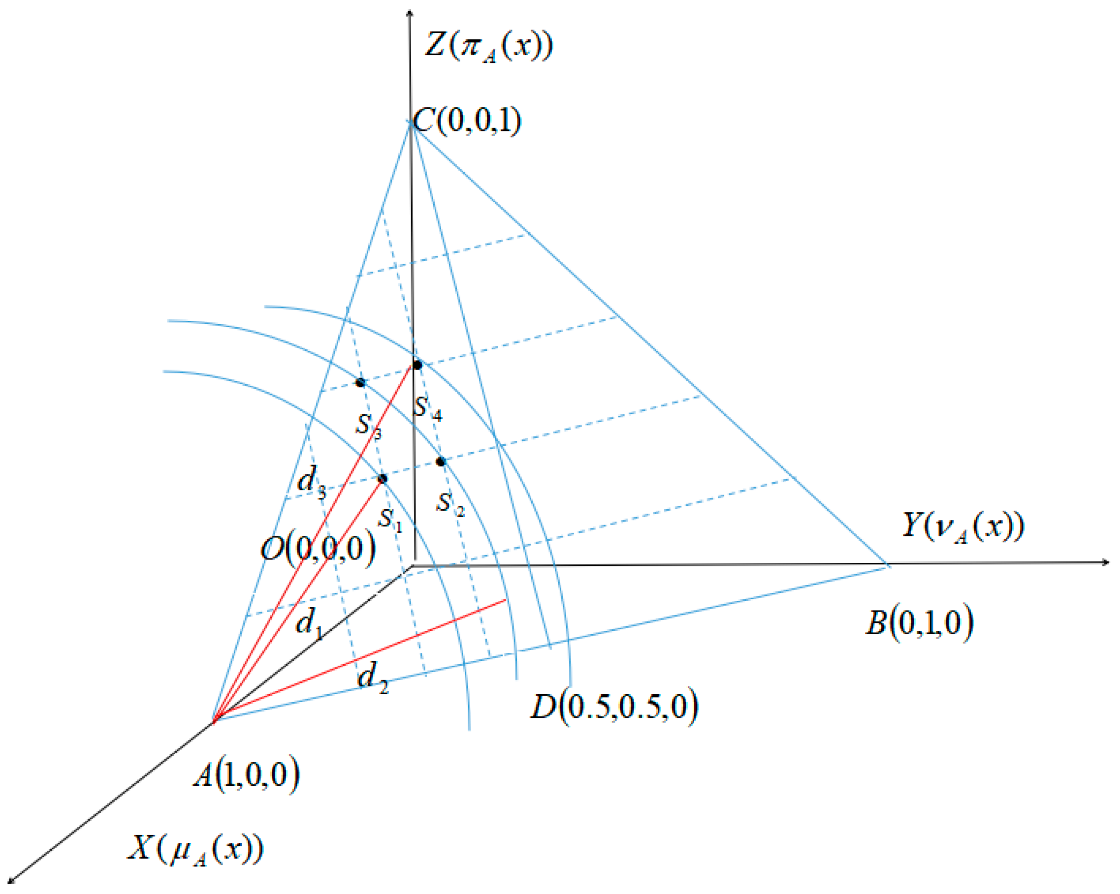 - Limited application scenarios of the entropy measure: The geometric construction logic of the intuitionistic fuzzy entropy measure formula based on TOPSIS proposed in this paper relies on the triangular region representation of intuitionistic fuzzy sets in three-dimensional space. When dealing with high-dimensional intuitionistic fuzzy decision-making problems, projection dimensionality reduction is required for calculation, and this process may lead to the loss of some uncertain information, thus affecting the accuracy of evaluation results.