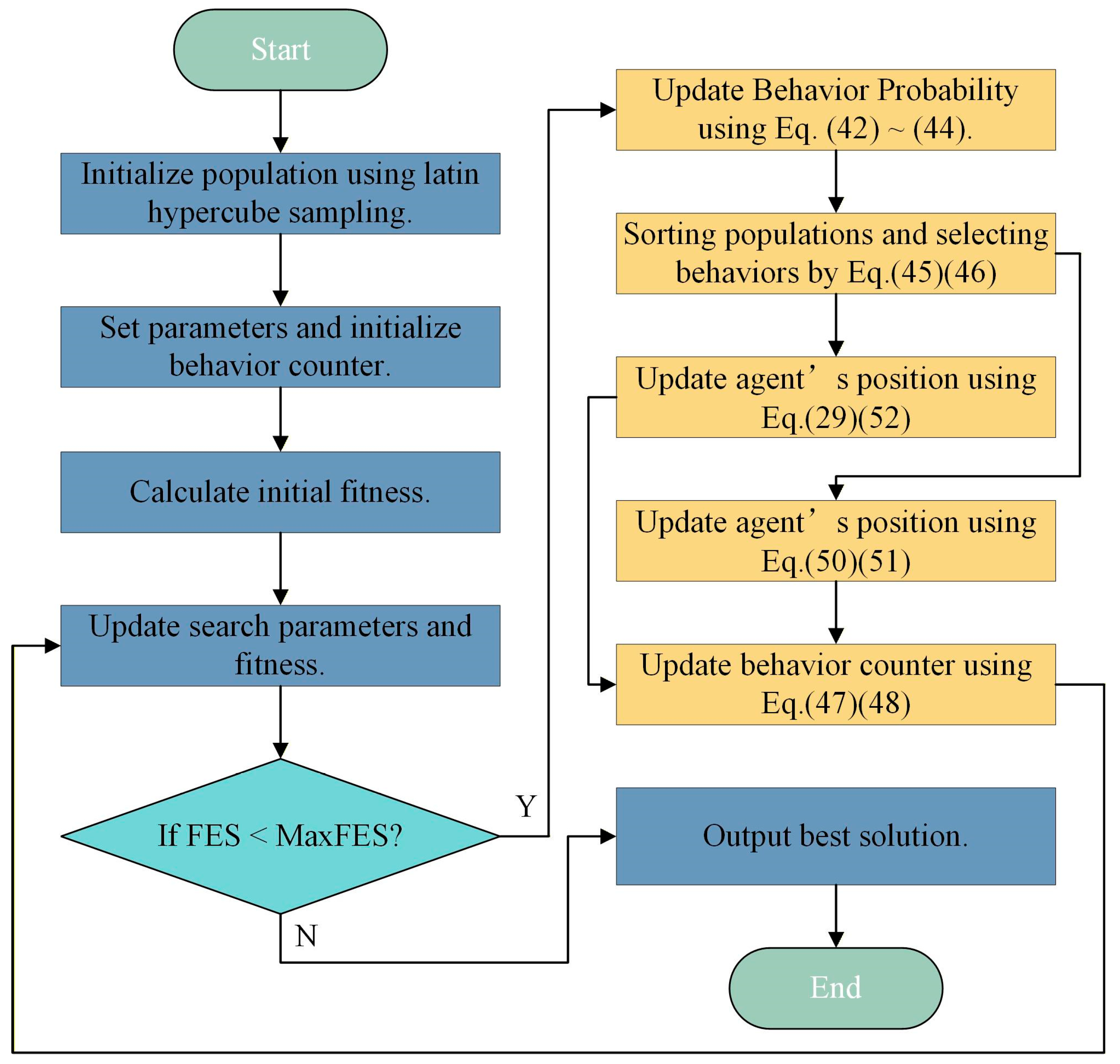| 1: Initialize population using Latin hypercube sampling and elite strategy. 2: Initialize behavior counter , . |