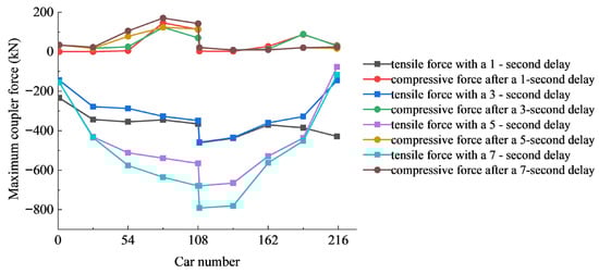 Under different action time delays of the controllable end-of-train device, Figure 9 shows the distribution of the maximum coupler force along the train length. Table 5 shows the maximum compressive coupler force (car number) and the maximum tensile coupler force (car number) under different action time delays, as well as the percentage increase in the maximum coupler force under the other three action time delays compared with the case of no action time delay. Figure 10 shows the maximum coupler force among the train under different time delay. Combining Figure 10 and Table 5, it can be seen that the maximum compressive coupler force under different action time delays is all located at car 109. Among them, the values of the maximum compressive coupler force under the working conditions of 1 s and 3 s action time delay of the end-of-train device are relatively small, both around 460 kN. The maximum tensile coupler force under different action time delays is all located at car 81. Among them, the value of the maximum tensile coupler force under the 3 s action time delay of the end-of-train device is the smallest, which is 123.3 kN. Except for the 1 s action time delay, the distribution laws of the maximum coupler force under the other three action time delays are the same. Both the maximum compressive coupler force and the maximum tensile coupler force increase with the increase in the action time delay. Since the tail cars are mainly affected by the action of the end-of-train device, when the action time delay of the end-of-train device is only 1 s, the range of cars affected by the end-of-train device increases. The tail cars brake earlier than the middle and rear cars, with a greater deceleration trend and more severe longitudinal impact.