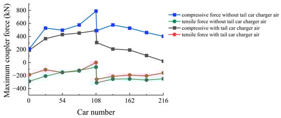 Figure 12 shows the distribution of the maximum coupler force along the train length with and without the tail car air charging device. Table 6 shows the comparison of the relief process with and without the tail car air charging device. Figure 13 shows the maximum coupler force among the train without and with tail car air charging device. Combining Figure 13 and Table 6, it can be seen that after adding the tail car air charging device, the change in the maximum compressive coupler force of the train is small; after adding the tail car air charging device, the maximum tensile coupler force of the train decreases from 780 kN to 489 kN, a reduction of 37%. This is because the train is mainly affected by the tensile coupler force during the relief process. From the simulation results, after adding the tail car air charging device, the relief synchronization of the front and rear cars is improved, the longitudinal impact is reduced, and the coupler force is decreased.