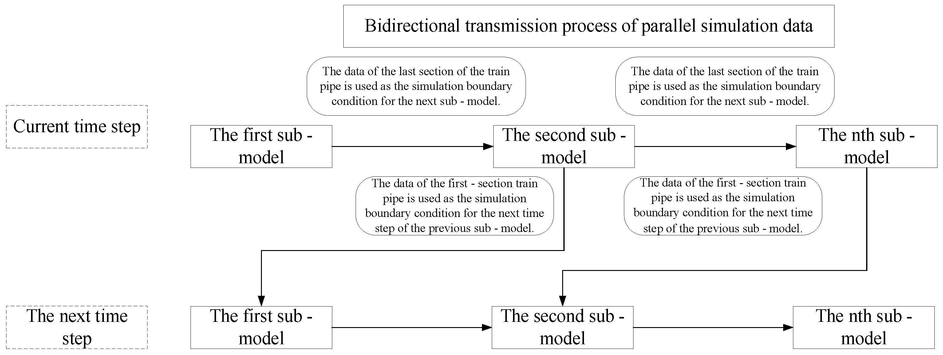 - A fluid simulation model of the air braking system for a 20,000-ton train was established using the parallel method. Based on the TCP/IP data transmission protocol, data such as pressure and temperature were bidirectionally transmitted between sub-models, which were used as boundary conditions for sub-model simulation. The accuracy of the parallel method was verified through simulation comparison.